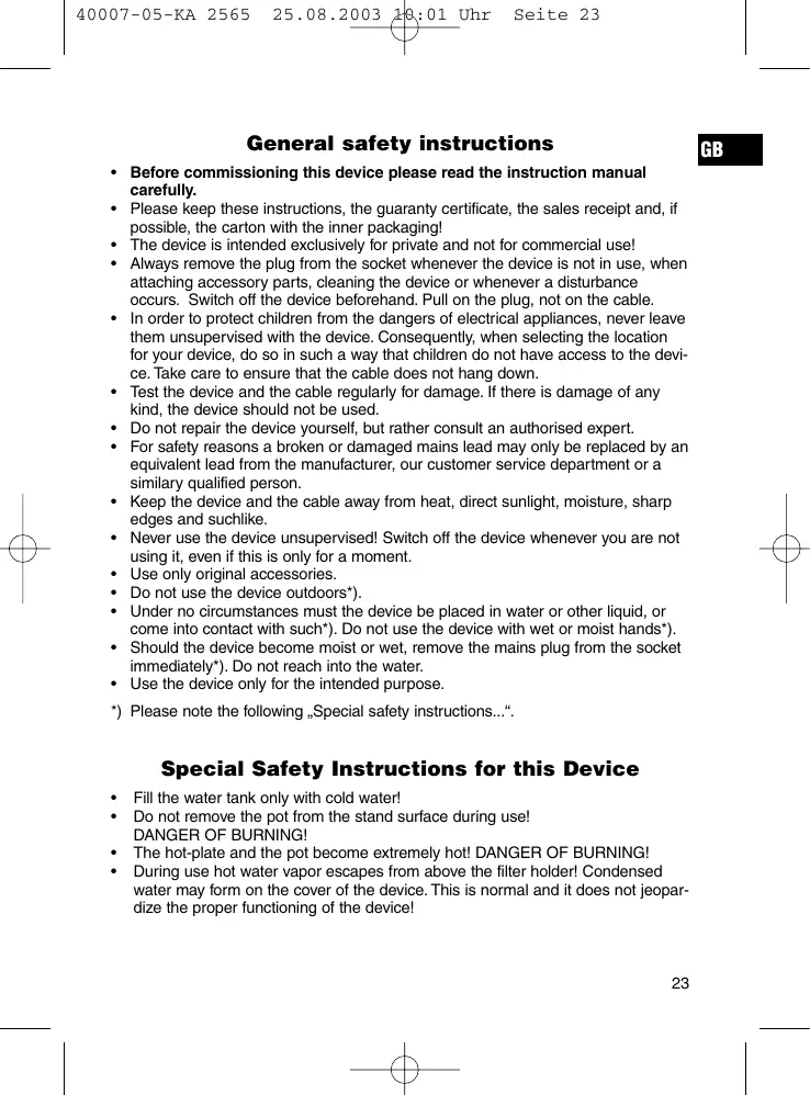• Please keep these instructions, the guaranty certificate, the sales receipt and, if possible, the carton with the inner packaging! • The device is intended exclusively for private and not for commercial use! • Always remove the plug from the socket whenever the device is not in use, when attaching accessory parts, cleaning the device or whenever a disturbance occurs. Switch off the device beforehand. Pull on the plug, not on the cable. • In order to protect children from the dangers of electrical appliances, never leave them unsupervised with the device. Consequently, when selecting the location for your device, do so in such a way that children do not have access to the device. Take care to ensure that the cable does not hang down. • Test the device and the cable regularly for damage. If there is damage of any kind, the device should not be used. • Do not repair the device yourself, but rather consult an authorised expert. • For safety reasons a broken or damaged mains lead may only be replaced by an equivalent lead from the manufacturer, our customer service department or a similary qualified person. • Keep the device and the cable away from heat, direct sunlight, moisture, sharp edges and suchlike. • Never use the device unsupervised! Switch off the device whenever you are not using it, even if this is only for a moment. • Use only original accessories. • Do not use the device outdoors*). • Under no circumstances must the device be placed in water or other liquid, or come into contact with such*). Do not use the device with wet or moist hands*). • Should the device become moist or wet, remove the mains plug from the socket immediately*). Do not reach into the water. • Use the device only for the intended purpose. *) Please note the following „Special safety instructions...“.