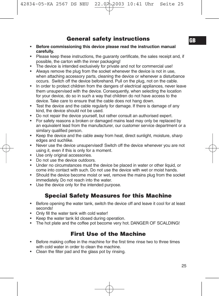 Before cleaning the machine you should always remove the mains lead and wait until the machine has cooled down. The machine should only be cleaned with a slightly damp cloth. Do not use any strong detergents or solvents for cleaning. The coffee pot and the filter pad should be cleaned by rinsing in cold water.