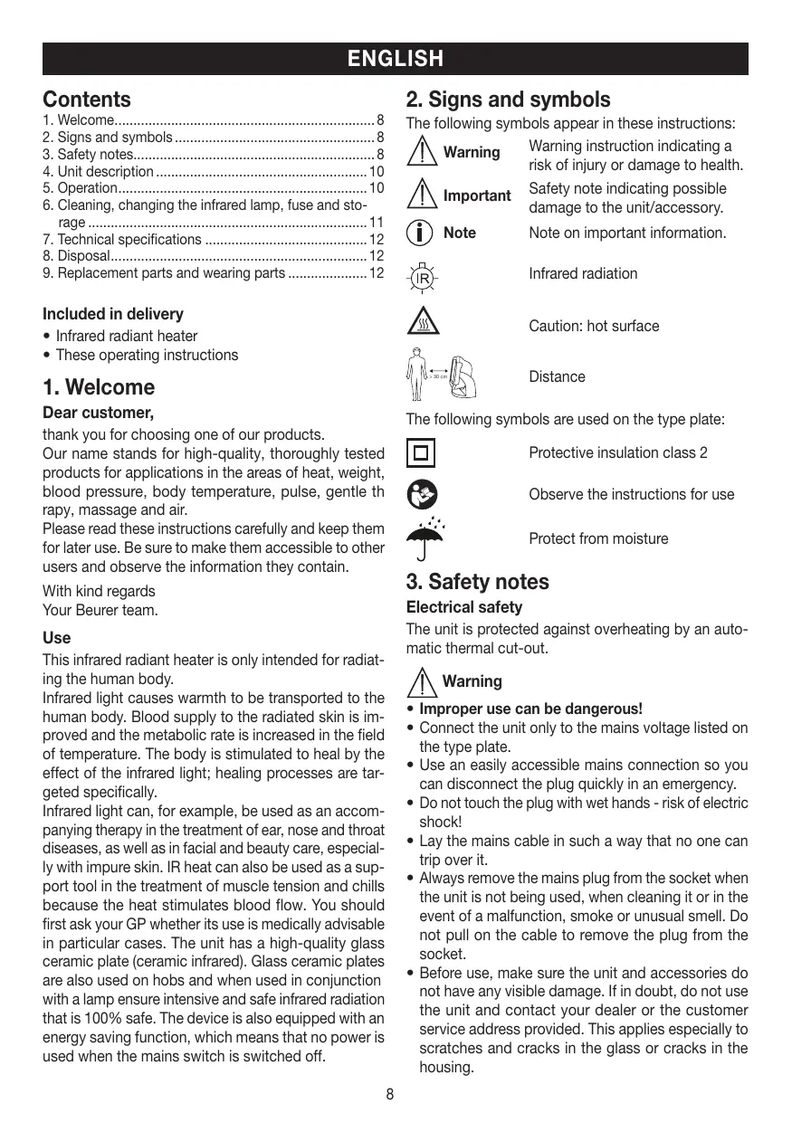 With kind regards Your Beurer team. Electrical safety The unit is protected against overheating by an automatic thermal cut-out. Use This infrared radiant heater is only intended for radiating the human body. Infrared light causes warmth to be transported to the human body. Blood supply to the radiated skin is improved and the metabolic rate is increased in the field of temperature. The body is stimulated to heal by the effect of the infrared light; healing processes are targeted specifically. Infrared light can, for example, be used as an accompanying therapy in the treatment of ear, nose and throat diseases, as well as in facial and beauty care, especially with impure skin. IR heat can also be used as a support tool in the treatment of muscle tension and chills because the heat stimulates blood flow. You should first ask your GP whether its use is medically advisable in particular cases. The unit has a high-quality glass ceramic plate (ceramic infrared). Glass ceramic plates are also used on hobs and when used in conjunction with a lamp ensure intensive and safe infrared radiation that is 100% safe. The device is also equipped with an energy saving function, which means that no power is used when the mains switch is switched off. Warning