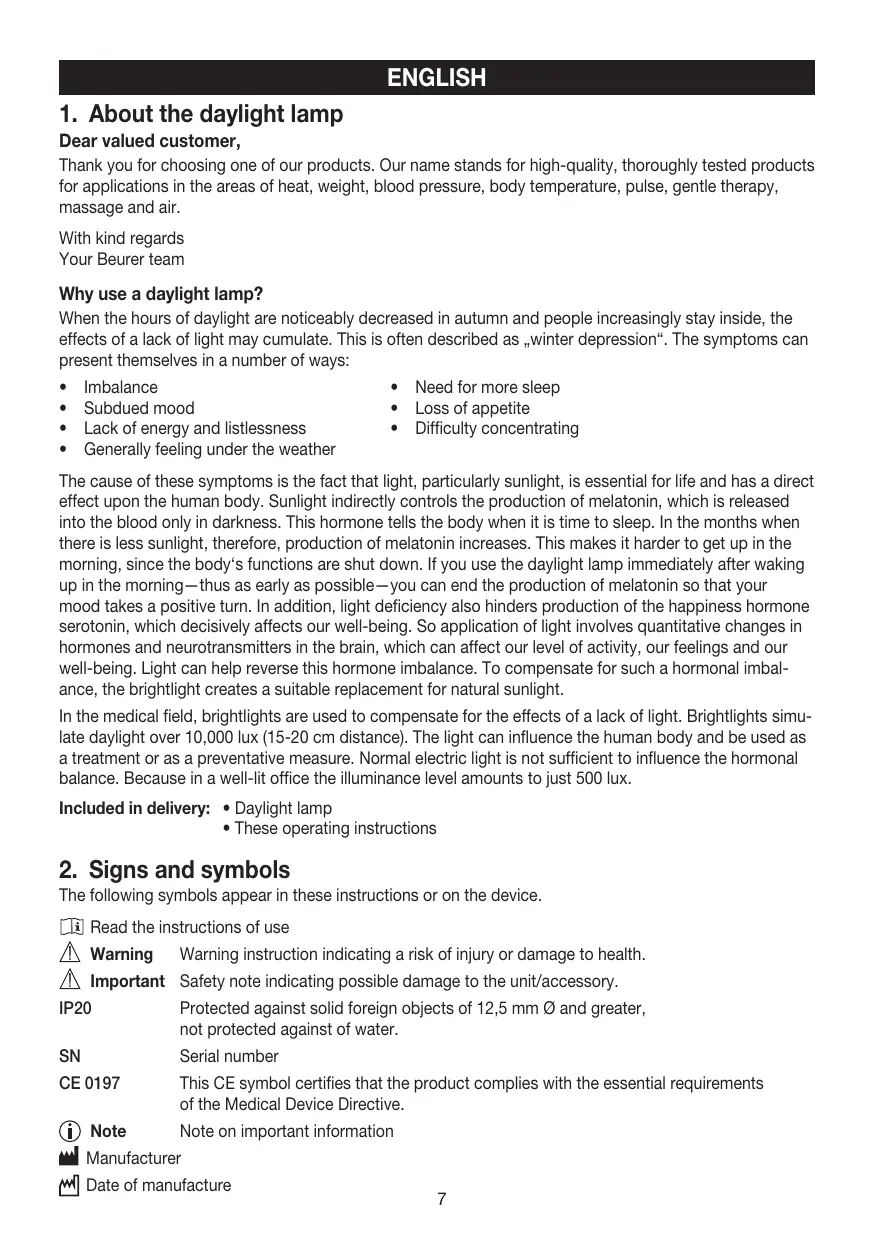 ENGLIsh 1. About the daylight lamp Dear valued customer, Thank you for choosing one of our products. Our name stands for high-quality, thoroughly tested products for applications in the areas of heat, weight, blood pressure, body temperature, pulse, gentle therapy, massage and air. With kind regards Your Beurer team