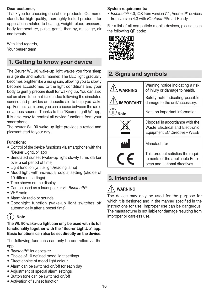 The WL 90 wake-up light can only be used with its full functionality together with the "Beurer LightUp" app. Basic functions can also be set directly on the device. The following functions can only be controlled via the app: • Bluetooth® loudspeaker • Choice of 10 defined mood light settings • Direct choice of mood light colour • Alarm can be switched on/off for each day • Adjustment of special alarm settings • Button tone can be switched on/off • Activation of sunset function