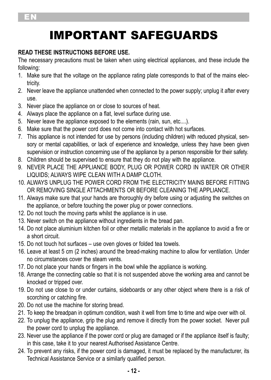 STORING BREAD Bread found on sale usually contains additives (chlorine, lime, tar colour agent, sorbitol, soya, etc.). Your bread contains none of these, so it does not keep as well as bread bought from the shop and has a different appearance. Also, it does not have the same flavour as shop-bought bread, it has the taste that bread should always have. It is best to eat it fresh, but it can be kept for two days at room temperature, in a polythene bag from which all the air has been removed. To freeze home-made bread, allow it to cool, put it in a polythene bag and remove all the air, then seal it and freeze. CLEANING ATTENTION: NEVER PLACE THE APPLIANCE BODY, PLUG OR POWER CORD IN WATER OR OTHER LIQUIDS; ALWAYS WIPE CLEAN WITH A DAMP CLOTH. ATTENTION: ALWAYS UNPLUG THE POWER CORD FROM THE ELECTRICITY MAINS BEFORE FITTING OR REMOVING SINGLE ATTACHMENTS OR BEFORE CLEANING THE APPLIANCE. ATTENTION: Let the appliance cool down before clearing it. ATTENTION: Never use metal utensils to remove anything from the bread pan (H) to avoid ruining the anti-stick coating of the bread pan. - Clean the bread pan (H) by rubbing the inside and outside with a damp cloth. - This is an exceptional circumstance; if the kneading arm (G) does not detach itself from the motor shaft, fill the bread pan with hot water and leave it for approximately 30 minutes. The kneading arm can then be pulled out and gently cleaned with a damp cloth. - Wash the measure (I) and the measuring spoon (L) with hot water and soap. - Wipe all of the other surfaces, inside and out, clean with a damp cloth. Use a little liquid detergent if necessary but be sure to rinse thoroughly as detergent residues could spoil the end result of your next loaf.