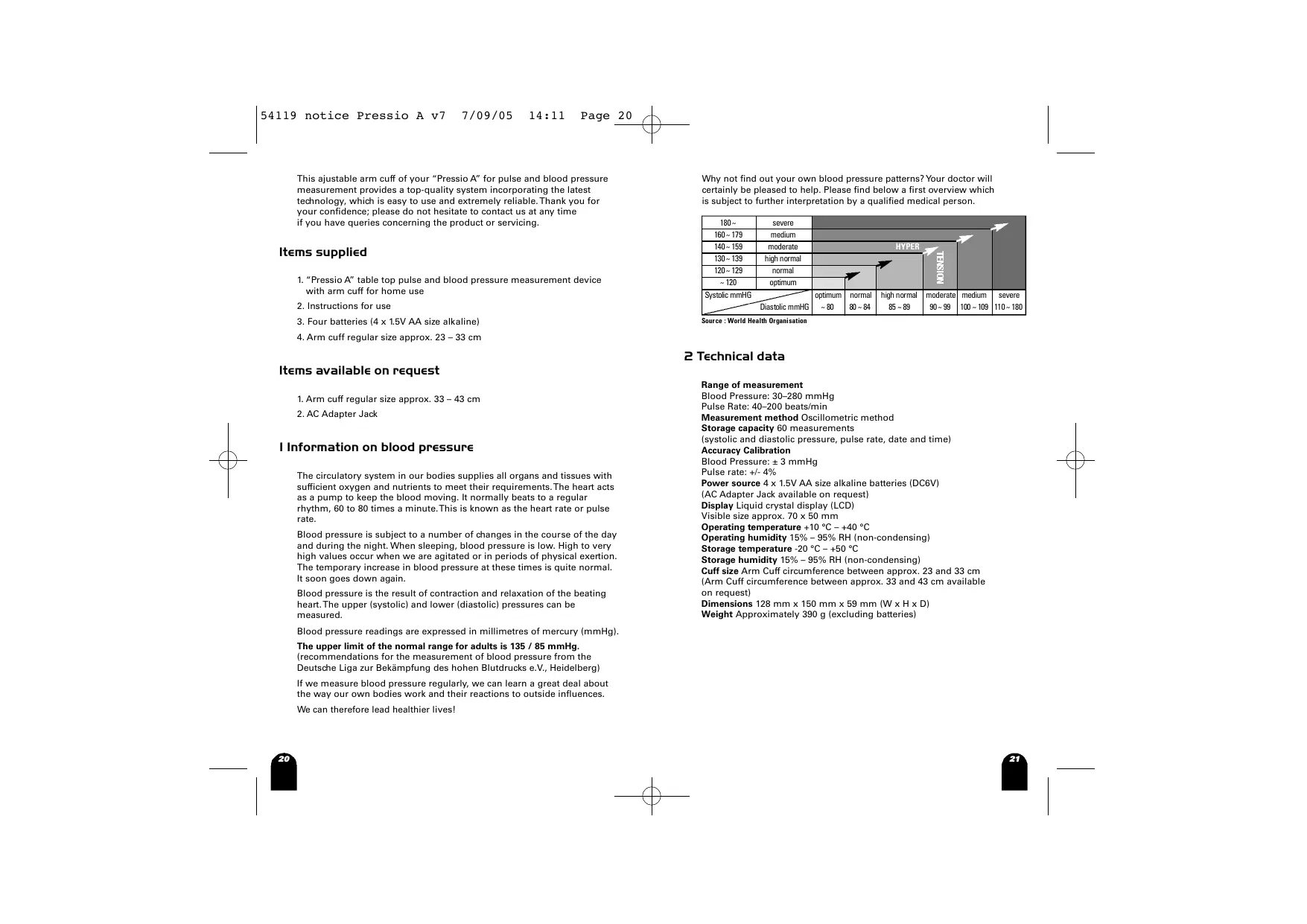 This adjustable arm cuff of your "Pressio A" for pulse and blood pressure measurement provides a top-quality system incorporating the latest technology, which is easy to use and extremely reliable. Thank you for your confidence; please do not hesitate to contact us at any time if you have queries concerning the product or servicing.