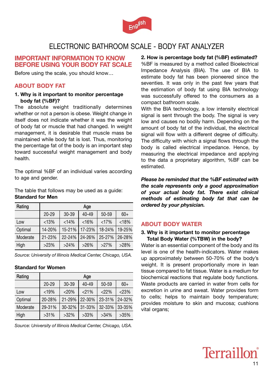 SPECIFICATIONS PRODUCT DESCRIPTION INTRODUCTION Terraillon body fat scale is designed and manufactured in a facility certified in ISO 9001 Quality