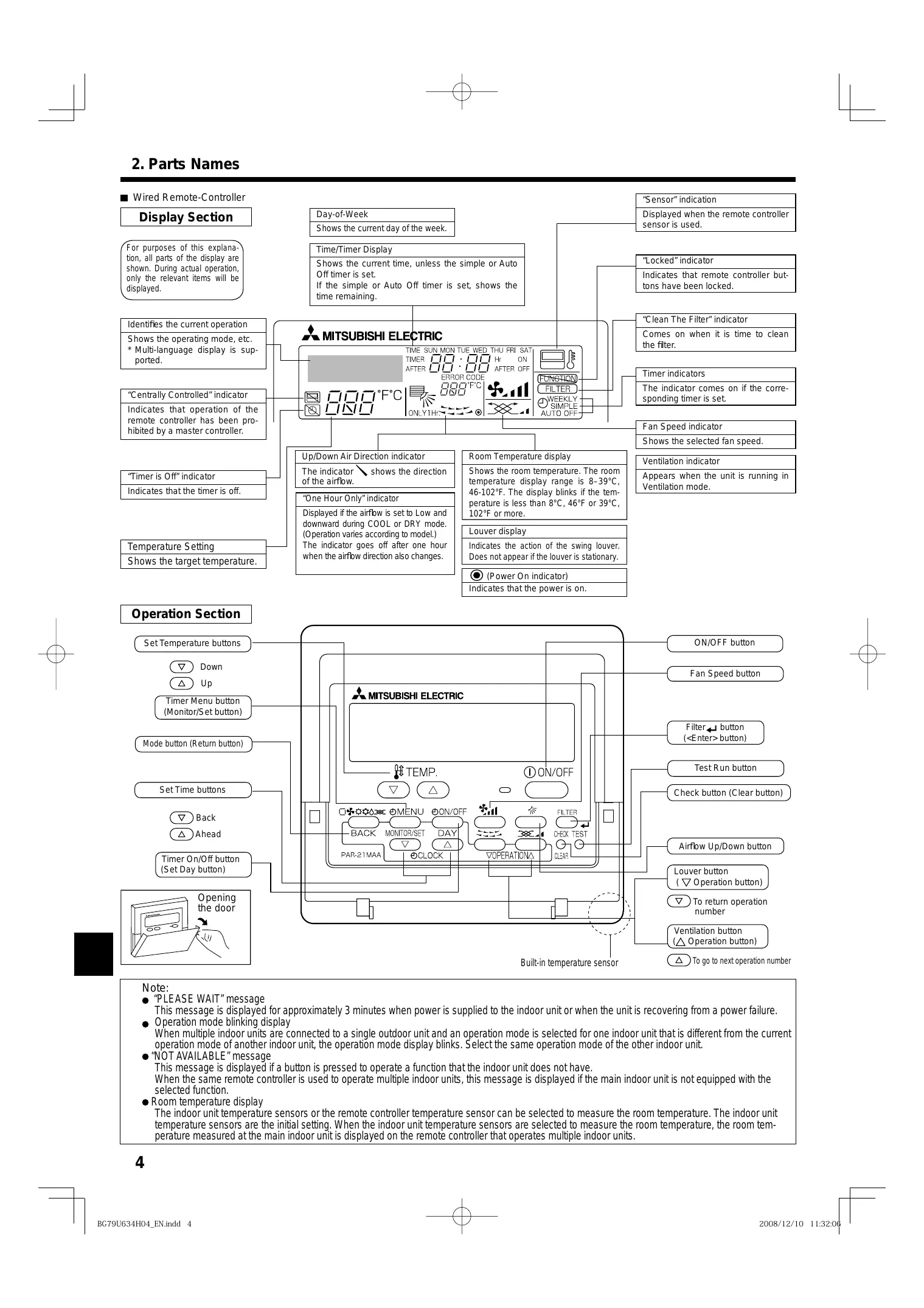 - Multi-language display is supported. Timer indicators The indicator comes on if the corresponding timer is set. “Centrally Controlled” indicator Indicates that operation of the remote controller has been prohibited by a master controller. Fan Speed indicator Shows the selected fan speed. “Timer is Off” indicator Indicates that the timer is off. Temperature Setting Shows the target temperature. Up/Down Air Direction indicator The indicator of the airflow. Shows the room temperature. The room temperature display range is 8–39°C, 46-102°F. The display blinks if the temperature is less than 8°C, 46°F or 39°C, 102°F or more. shows the direction “One Hour Only” indicator Displayed if the airflow is set to Low and downward during COOL or DRY mode. (Operation varies according to model.) The indicator goes off after one hour when the airflow direction also changes. Ventilation indicator Appears when the unit is running in Ventilation mode. Louver display Indicates the action of the swing louver. Does not appear if the louver is stationary. (Power On indicator) Indicates that the power is on. Operation Section ON/OFF button Set Temperature buttons Down Back Ahead Airflow Up/Down button Timer On/Off button (Set Day button) Opening the door To return operation number Ventilation button ( Operation button) Built-in temperature sensor To go to next operation number Note: “PLEASE WAIT” message This message is displayed for approximately 3 minutes when power is supplied to the indoor unit or when the unit is recovering from a power failure. Operation mode blinking display When multiple indoor units are connected to a single outdoor unit and an operation mode is selected for one indoor unit that is different from the current operation mode of another indoor unit, the operation mode display blinks. Select the same operation mode of the other indoor unit. “NOT AVAILABLE” message This message is displayed if a button is pressed to operate a function that the indoor unit does not have. When the same remote controller is used to operate multiple indoor units, this message is displayed if the main indoor unit is not equipped with the selected function. Room temperature display The indoor unit temperature sensors or the remote controller temperature sensor can be selected to measure the room temperature. The indoor unit temperature sensors are the initial setting. When the indoor unit temperature sensors are selected to measure the room temperature, the room temperature measured at the main indoor unit is displayed on the remote controller that operates multiple indoor units.