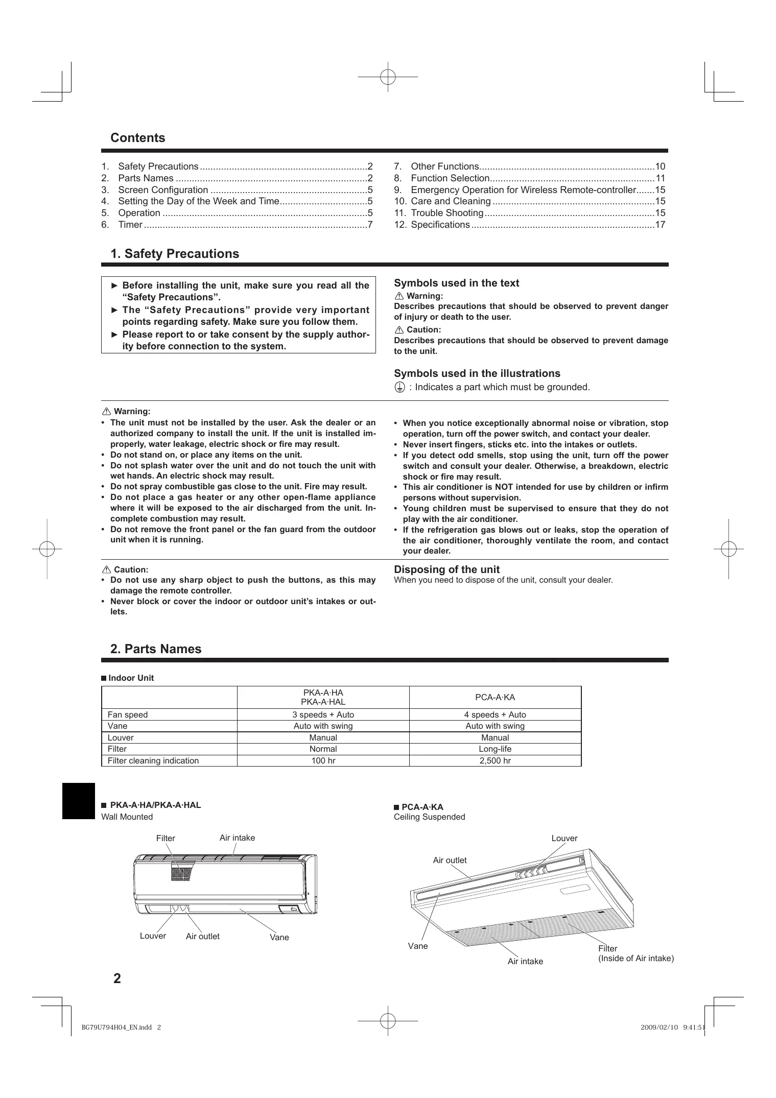 Indoor Unit PKA-A·HA PKA-A·HAL 3 speeds + Auto Auto with swing Manual Normal 100 hr Fan speed Vane Louver Filter Filter cleaning indication