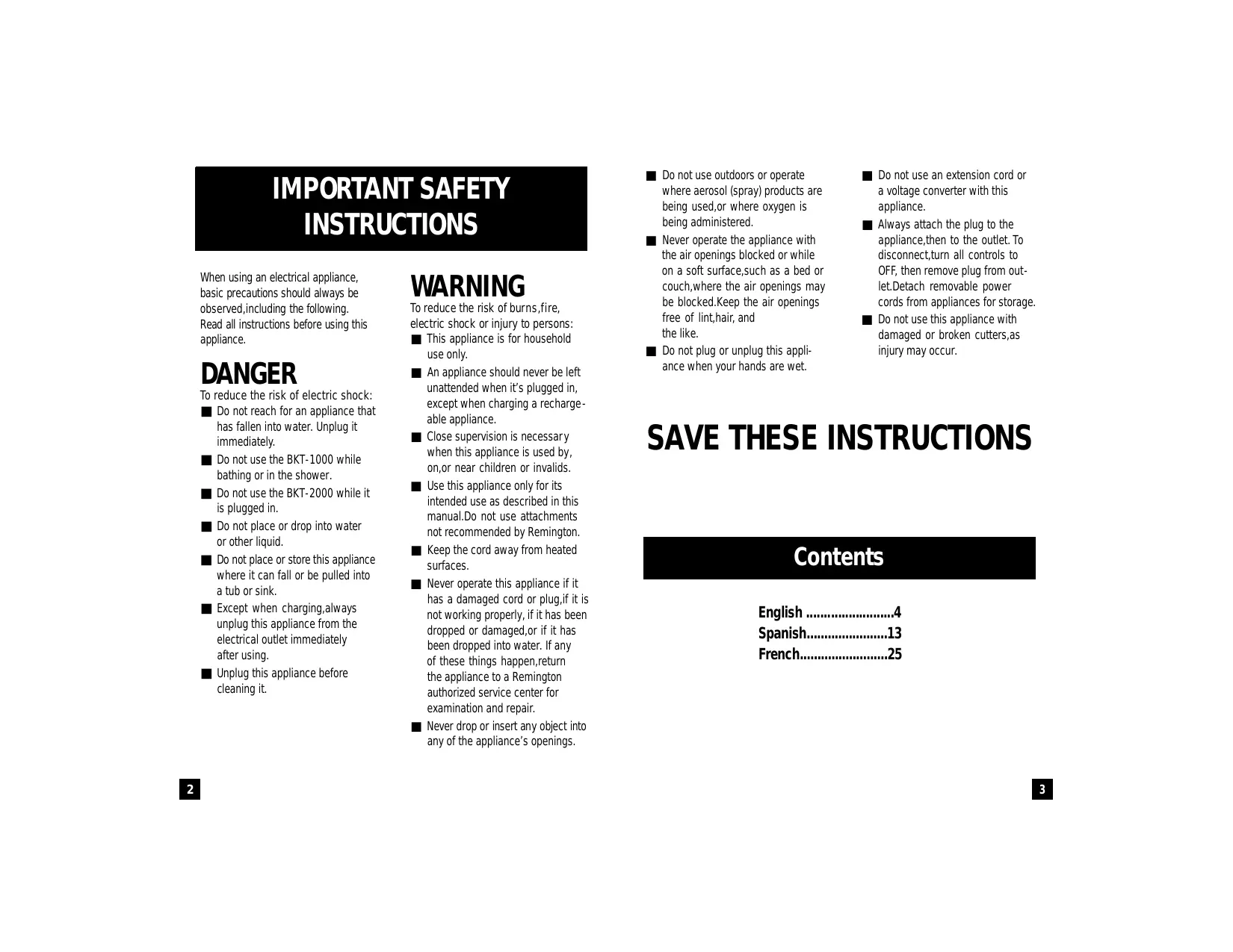 WARNING To reduce the risk of burn s ,f i re, electric shock or injury to persons: ■ This appliance is for household use only. ■ An appliance should never be left unattended when it’s plugged in, except when charging a rechargeable appliance. ■ Close supervision is necessar y when this appliance is used by, on,or near children or invalids. ■ Use this appliance only for its intended use as described in this manual.Do not use attachments not recommended by Remington. ■ Keep the cord away from heated surfaces. ■ Never operate this appliance if it has a damaged cord or plug,if it is not working properly, if it has been dropped or damaged,or if it has been dropped into water. If any of these things happen,return the appliance to a Remington authorized service center for examination and repair. ■ Never drop or insert any object into any of the appliance’s openings. ■ Do not use outdoors or operate where aerosol (spray) products are being used,or where oxygen is being administered. ■ Never operate the appliance with the air openings blocked or while on a soft surface,such as a bed or couch,where the air openings may be blocked.Keep the air openings free of lint,hair, and the like. ■ Do not plug or unplug this appliance when your hands are wet. ■ Do not use an extension cord or a voltage converter with this appliance. ■ Always attach the plug to the appliance,then to the outlet. To disconnect,turn all controls to OFF, then remove plug from outlet.Detach removable power cords from appliances for storage. ■ Do not use this appliance with damaged or broken cutters,as injury may occur.