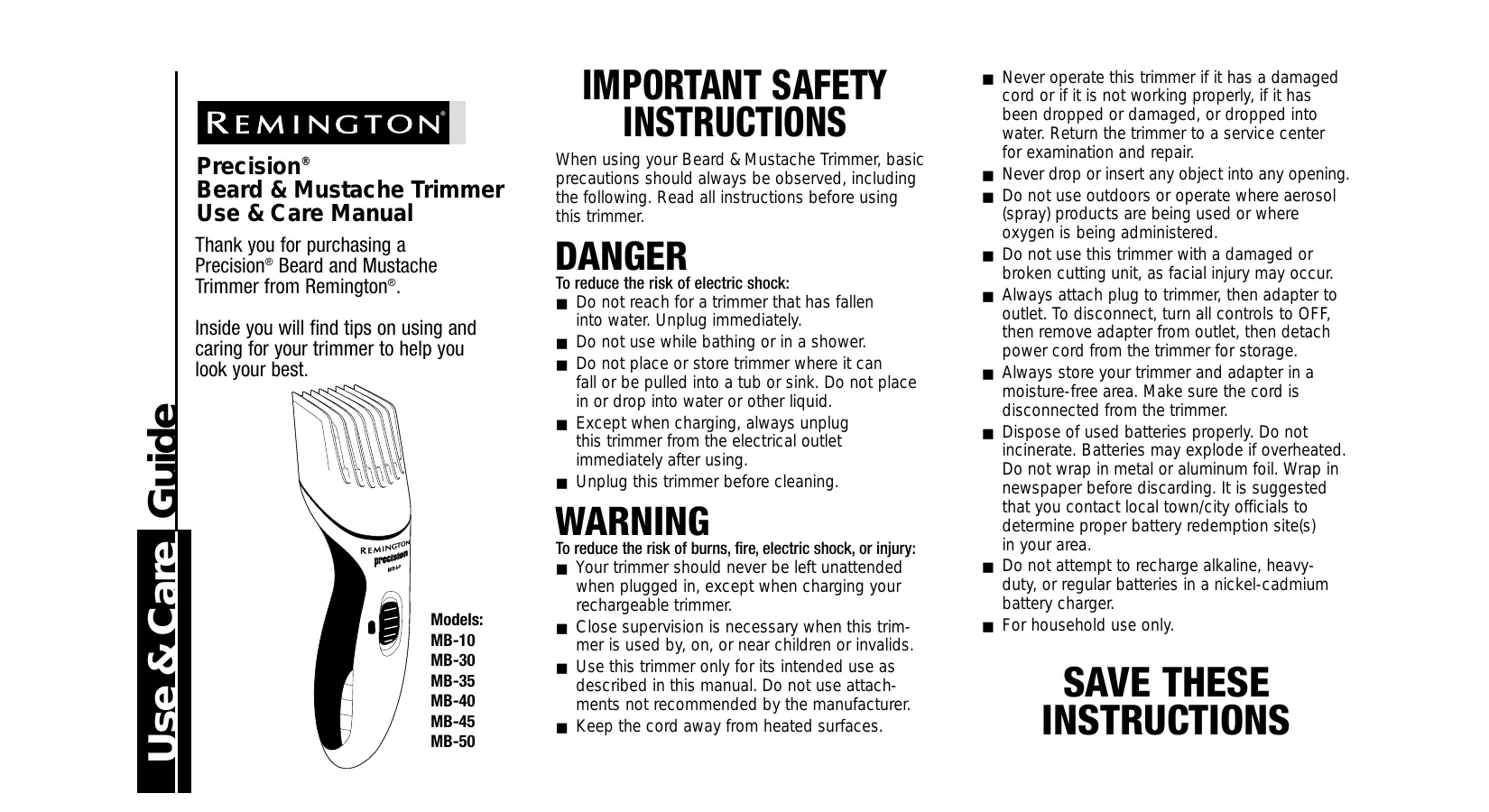 When using your Beard & Mustache Trimmer, basic precautions should always be observed, including the following. Read all instructions before using this trimmer. Thank you for purchasing a Precision® Beard and Mustache Trimmer from Remington®. DANGER To reduce the risk of electric shock: Inside you will find tips on using and caring for your trimmer to help you look your best.