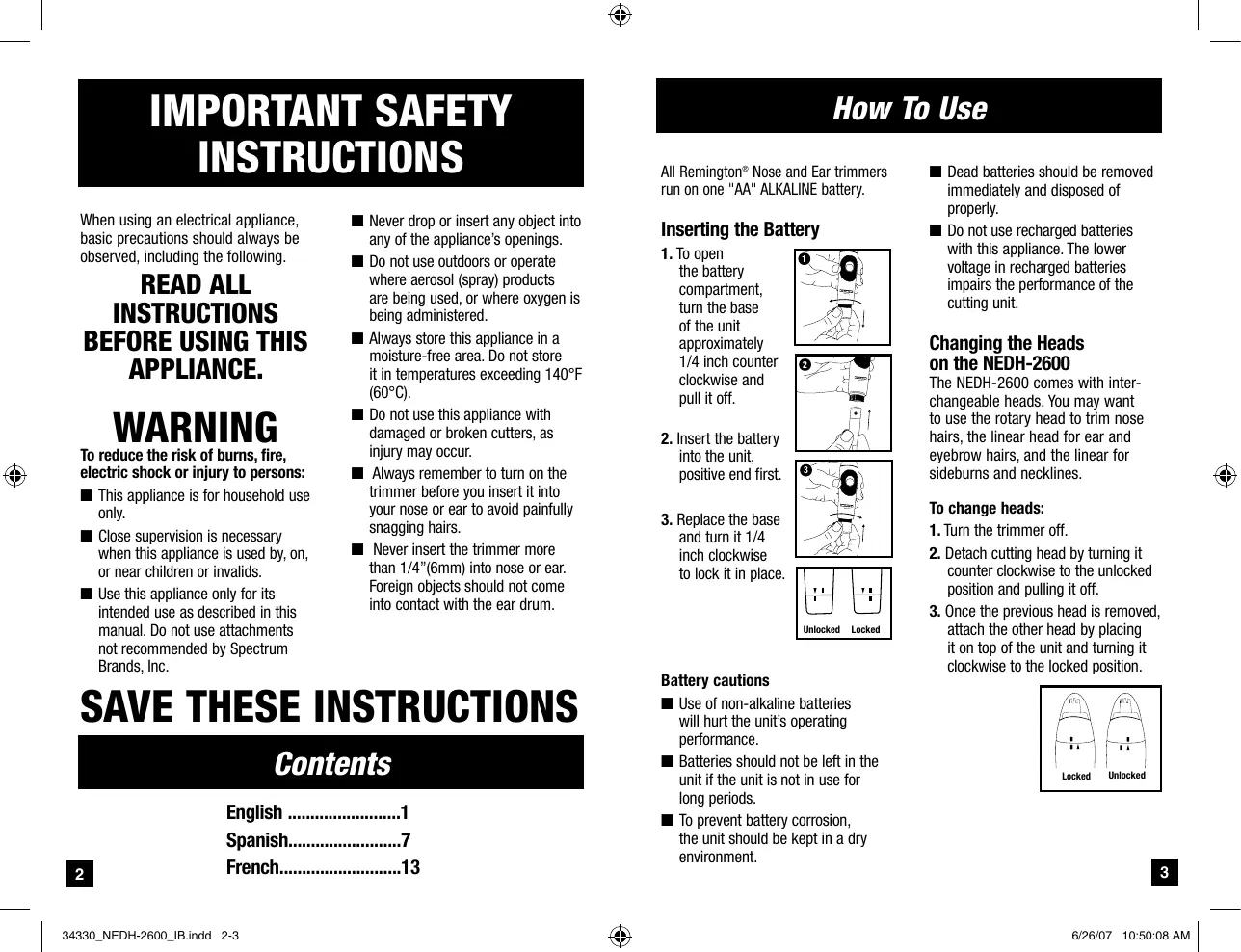 English .........................1 Spanish.........................7 French...........................13 34330_NEDH-2600_IB.indd 2-3 How To Use All Remington® Nose and Ear trimmers run on one "AA" ALKALINE battery. Inserting the Battery