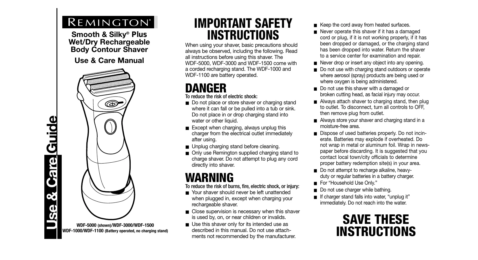 Smooth & Silky Plus Wet/Dry Rechargeable Body Contour Shaver Use & Care Manual When using your shaver, basic precautions should always be observed, including the following. Read all instructions before using this shaver. The WDF-5000, WDF-3000 and WDF-1500 come with a corded recharging stand. The WDF-1000 and WDF-1100 are battery operated. DANGER To reduce the risk of electric shock: Do not place or store shaver or charging stand where it can fall or be pulled into a tub or sink. Do not place in or drop charging stand into water or other liquid. Except when charging, always unplug this charger from the electrical outlet immediately after using. Unplug charging stand before cleaning. Only use Remington supplied charging stand to charge shaver. Do not attempt to plug any cord directly into shaver.