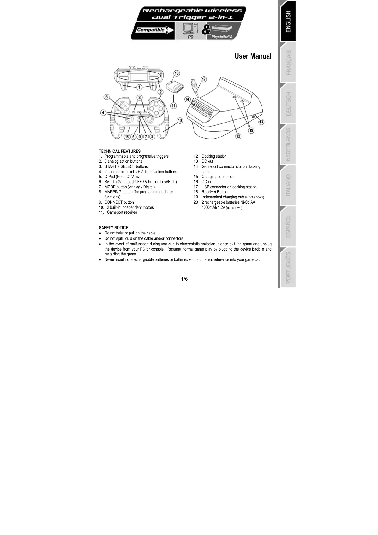 - The gamepad automatically turns off when it has not been used for 5 minutes. - To “wake” it, press any button. • MULTIPLAYER / CHANNEL AUTO-SWITCHING INFORMATION: - You can play with up to 4 Dual Trigger Gamepads. All channels are detected automatically. - When playing in multiplayer mode, if you wish to switch gamepads in the course of a game, press the Receiver (19) and CONNECT buttons on your gamepad simultaneously. • CHARGING THE RECHARGEABLE BATTERIES: - To recharge the batteries, connect the USB connector on the docking station (17) to a USB port on your PC or PlayStation 2. - Place your gamepad on the docking station, taking care to position the gamepad’s charging connectors on top of the docking station’s charging connectors (15) and make sure that they make contact. - The CHARGE LED turns red during charging. - When the batteries are fully charged, the CHARGE LED turns green. - Note: you can use the gamepad while it is charging. To do so, connect the independent charging cable (19) to the gamepad’s DC in (16) and the docking station’s DC out (13) connectors. TRIGGER MAPPING All analog buttons and mini-stick directions (axes) can be mapped to the left and right triggers (except DPad and START, SELECT, L3 and R3 buttons). • MAPPING button (8) (used to map left and right triggers): - Press and release the MAPPING button (LED flashes slowly). - Press and release the button or direction you want to assign to the trigger (LED flashes quickly). - Press and release the trigger assigned to this function (LED turns off). • EEPROM: Your gamepad includes an internal memory chip, which stores your last mapping configuration even if you turn your gamepad off.