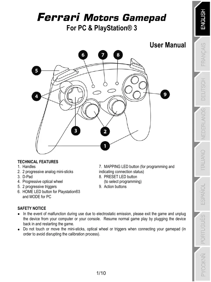TECHNICAL FEATURES 1. Handles 2. 2 progressive analog mini-sticks 3. D-Pad 4. Progressive optical wheel 5. 2 progressive triggers 6. HOME LED button for Playstation®3 and MODE for PC
