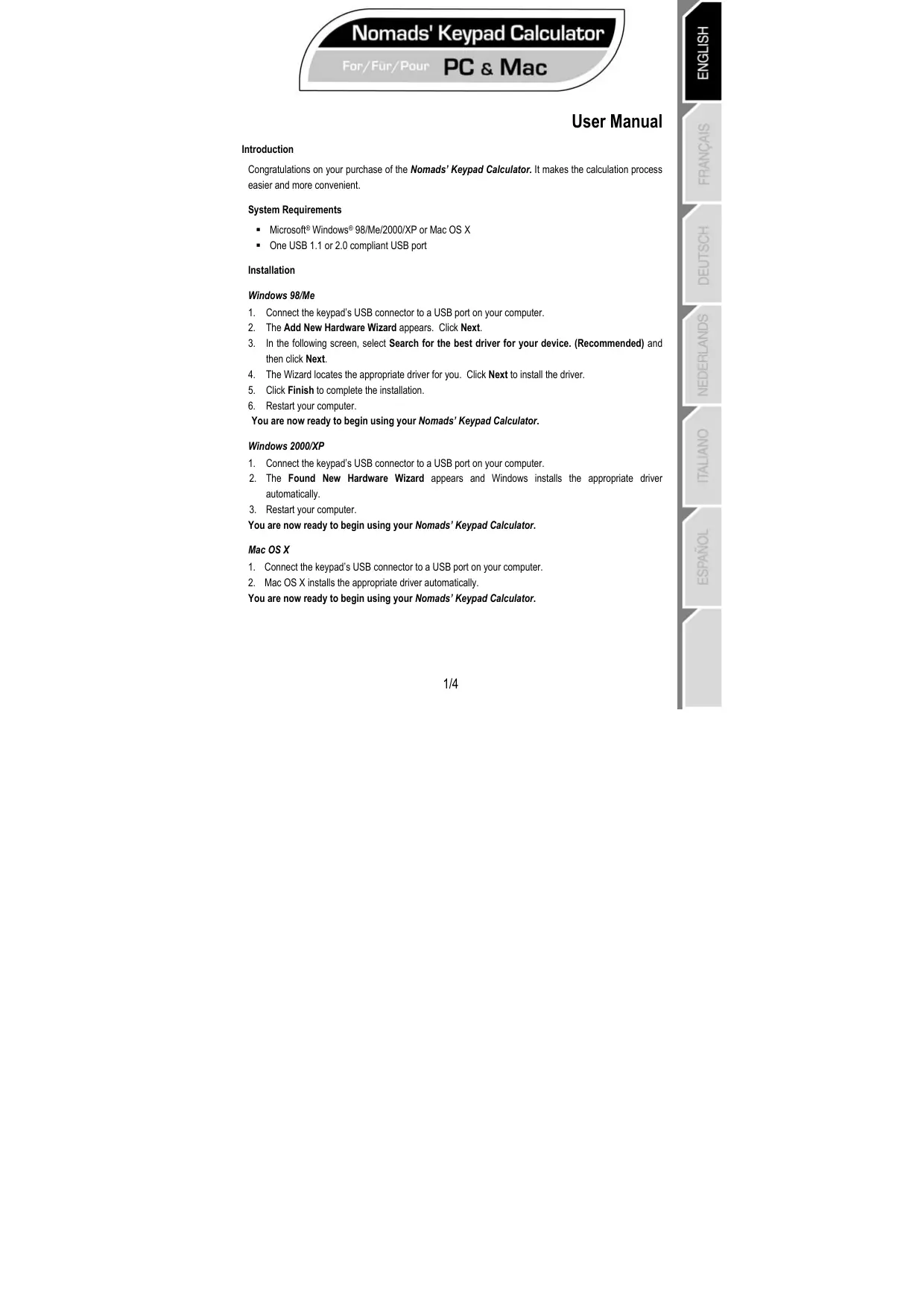Introduction Congratulations on your purchase of the Nomads’ Keypad Calculator. It makes the calculation process easier and more convenient. System Requirements Microsoft® Windows® 98/Me/2000/XP or Mac OS X One USB 1.1 or 2.0 compliant USB port Installation Windows 98/Me 1. Connect the keypad’s USB connector to a USB port on your computer. 2. The Add New Hardware Wizard appears. Click Next. 3. In the following screen, select Search for the best driver for your device. (Recommended) and then click Next. 4. The Wizard locates the appropriate driver for you. Click Next to install the driver. 5. Click Finish to complete the installation. 6. Restart your computer. You are now ready to begin using your Nomads’ Keypad Calculator. Windows 2000/XP 1. Connect the keypad’s USB connector to a USB port on your computer. 2. The Found New Hardware Wizard appears and Windows installs the appropriate driver automatically. 3. Restart your computer. You are now ready to begin using your Nomads’ Keypad Calculator. Mac OS X 1. Connect the keypad’s USB connector to a USB port on your computer. 2. Mac OS X installs the appropriate driver automatically. You are now ready to begin using your Nomads’ Keypad Calculator.