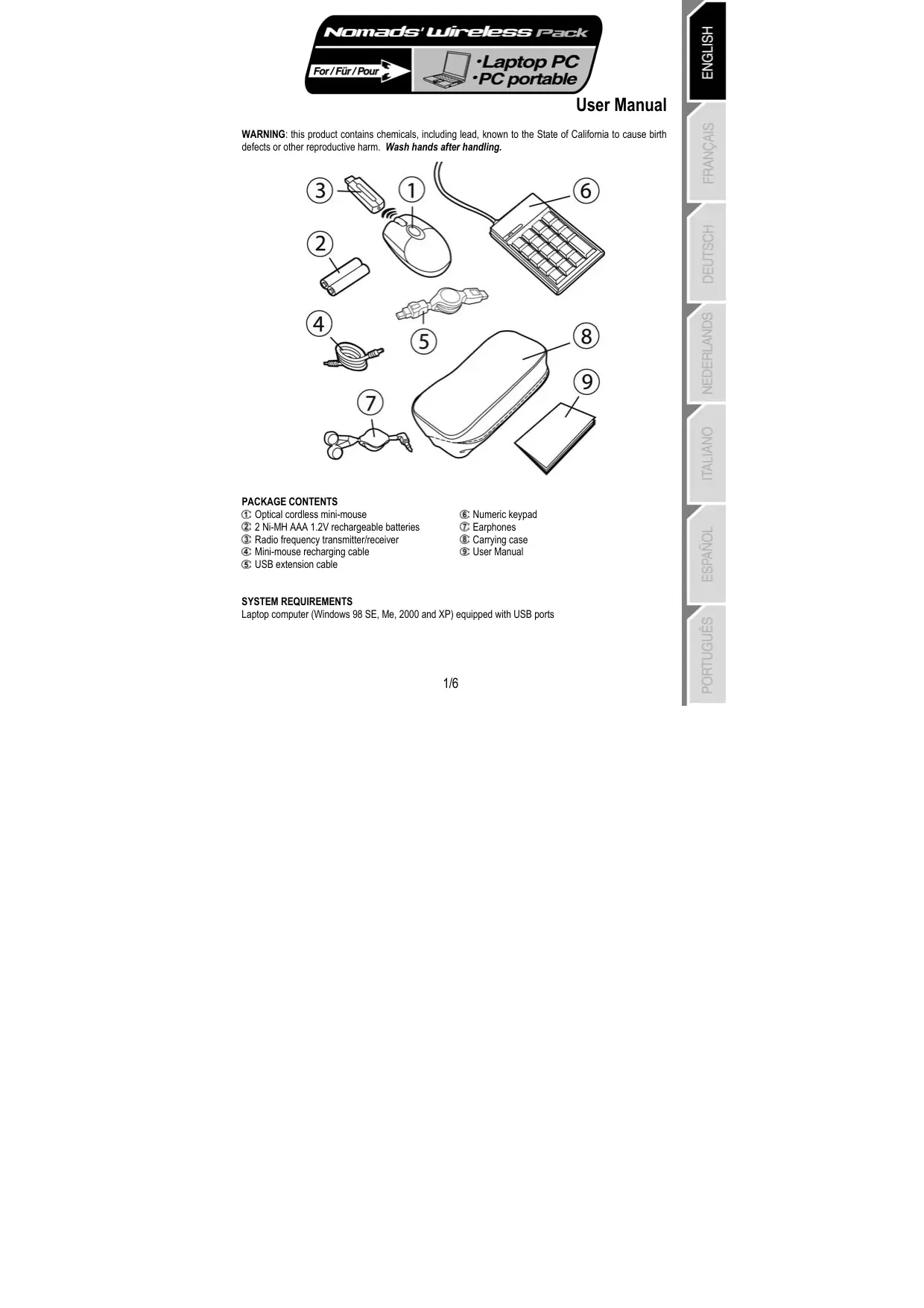 - Never open up your Nomads’ Wireless Pack accessories, as you risk damaging the internal components. - Place your Nomads’ Wireless Pack on a flat surface to avoid the risk of it falling. - Do not pull on or twist the cable(s). - Never recharge your mini-mouse with a recharging cable other than the one provided with your Nomads’ Wireless Pack. - Do not bother removing the batteries when you are not using the mini-mouse, as it is equipped with a battery-saving system. - Disconnect your Nomads’ Wireless Pack and remove the batteries from the mini-mouse before cleaning. Do not use liquid or aerosol cleaners. Use a damp cloth for cleaning.