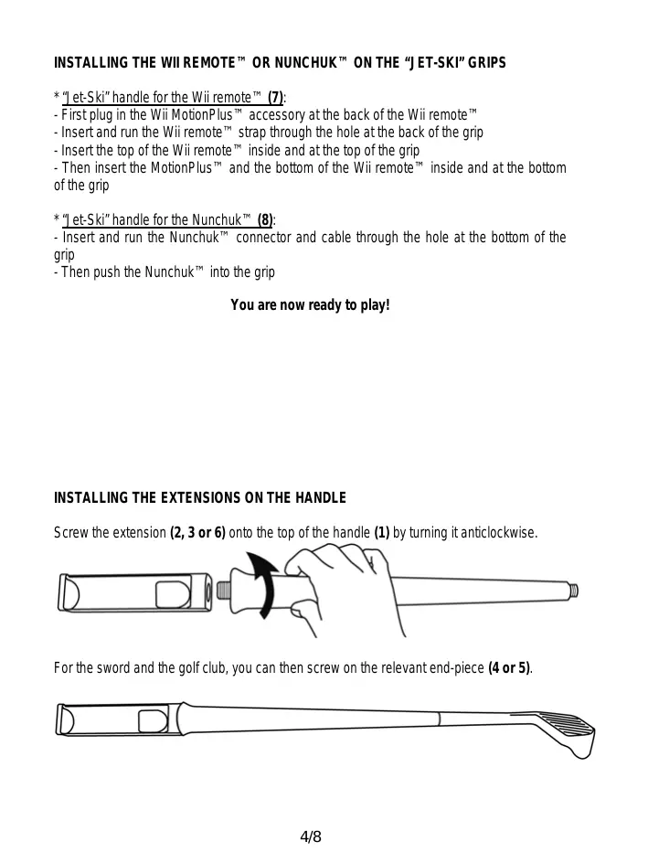 * “Jet-Ski” handle for the Wii remote™ (7): - First plug in the Wii MotionPlus™ accessory at the back of the Wii remote™ - Insert and run the Wii remote™ strap through the hole at the back of the grip - Insert the top of the Wii remote™ inside and at the top of the grip - Then insert the MotionPlus™ and the bottom of the Wii remote™ inside and at the bottom of the grip * “Jet-Ski” handle for the Nunchuk™ (8): - Insert and run the Nunchuk™ connector and cable through the hole at the bottom of the grip - Then push the Nunchuk™ into the grip You are now ready to play!