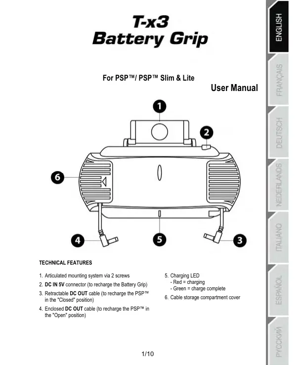 TECHNICAL FEATURES 1. Articulated mounting system via 2 screws 2. DC IN 5V connector (to recharge the Battery Grip) 3. Retractable DC OUT cable (to recharge the PSP™ in the "Closed" position) 4. Enclosed DC OUT cable (to recharge the PSP™ in the "Open" position)