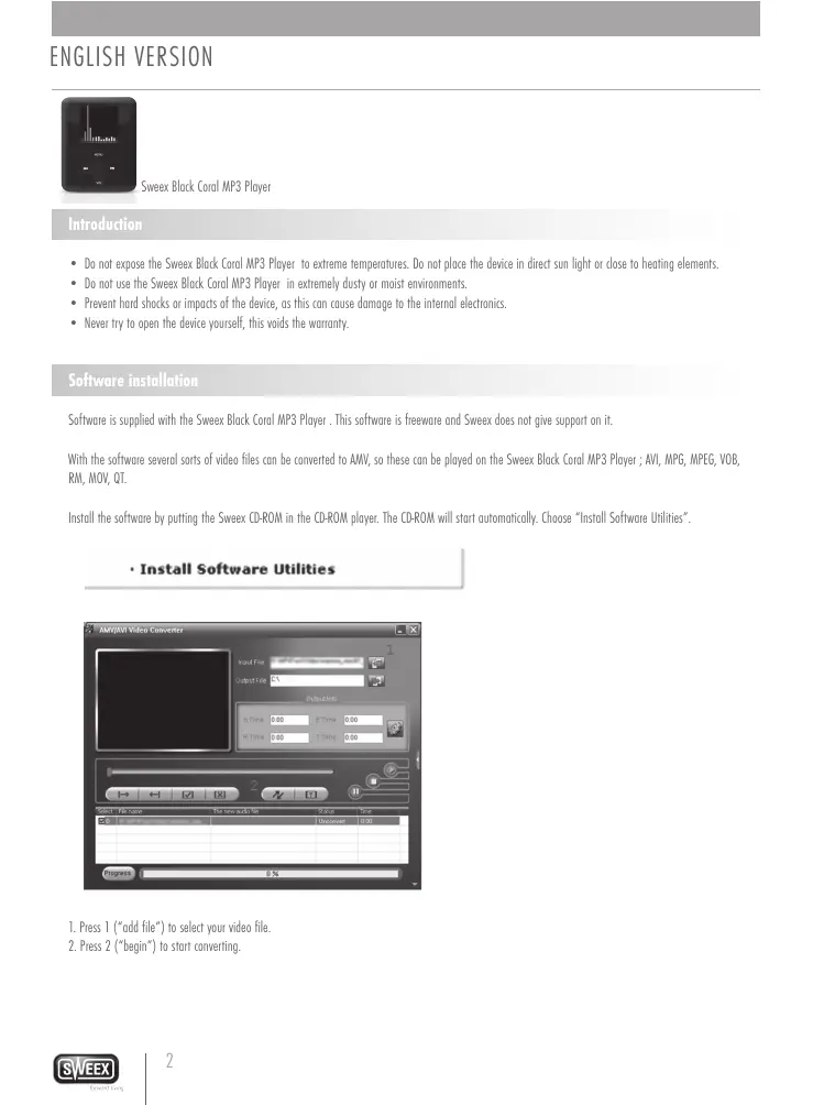 D o not expose the Sweex Black Coral MP3 Player to extreme temperatures. Do not place the device in direct sun light or close to heating elements. Do not use the Sweex Black Coral MP3 Player in extremely dusty or moist environments. Prevent hard shocks or impacts of the device, as this can cause damage to the internal electronics. Never try to open the device yourself, this voids the warranty. Software installation Software is supplied with the Sweex Black Coral MP3 Player . This software is freeware and Sweex does not give support on it. With the software several sorts of video files can be converted to AMV, so these can be played on the Sweex Black Coral MP3 Player ; AVI, MPG, MPEG, VOB, RM, MOV, QT. Install the software by putting the Sweex CD-ROM in the CD-ROM player. The CD-ROM will start automatically. Choose “Install Software Utilities”.