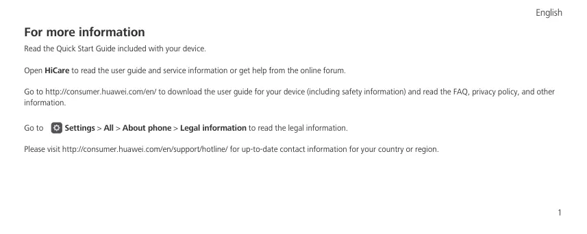 For more information Read the Quick Start Guide included with your device. Open HiCare to read the user guide and service information or get help from the online forum. Go to http://consumer.huawei.com/en/ to download the user guide for your device (including safety information) and read the FAQ, privacy policy, and other information. Go to Settings > All > About phone > Legal information to read the legal information. Please visit http://consumer.huawei.com/en/support/hotline/ for up-to-date contact information for your country or region.