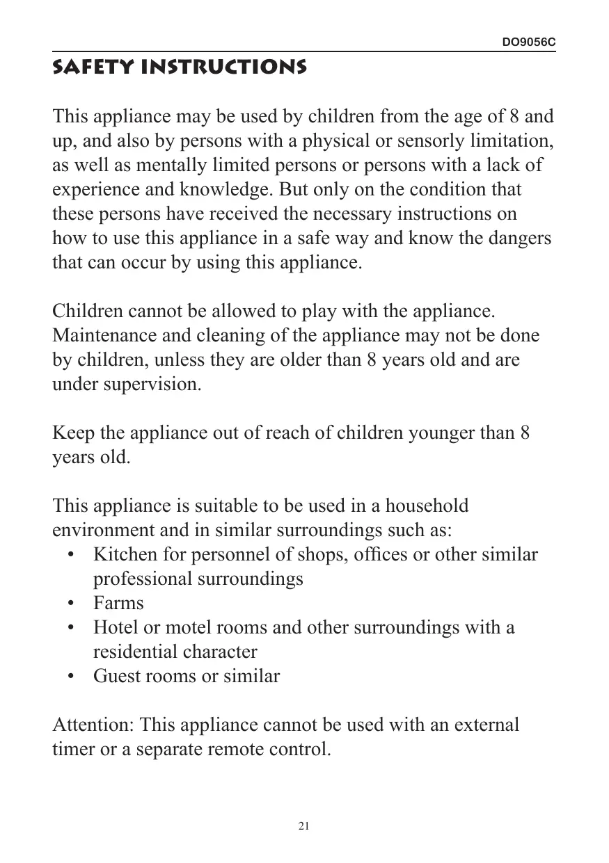 Attention: This appliance cannot be used with an external timer or a separate remote control.