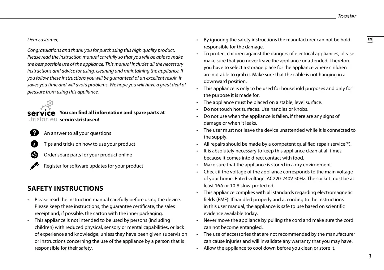 Dear customer, Congratulations and thank you for purchasing this high quality product. Please read the instruction manual carefully so that you will be able to make the best possible use of the appliance. This manual includes all the necessary instructions and advice for using, cleaning and maintaining the appliance. If you follow these instructions you will be guaranteed of an excellent result, it saves you time and will avoid problems. We hope you will have a great deal of pleasure from using this appliance. You can find all information and spare parts at service.tristar.eu! An answer to all your questions Tips and tricks on how to use your product Order spare parts for your product online Register for software updates for your product Safety instructions