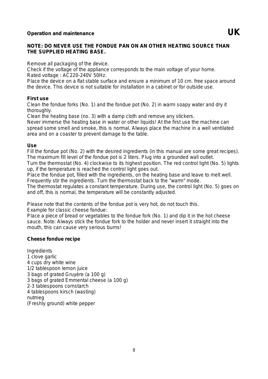 Place a piece of bread or vegetables to the fondue fork (No. 1) and dip it in the hot cheese sauce. Note: Always stick the fondue fork to the holder and never insert it straight into the mouth, this can cause very serious burns!