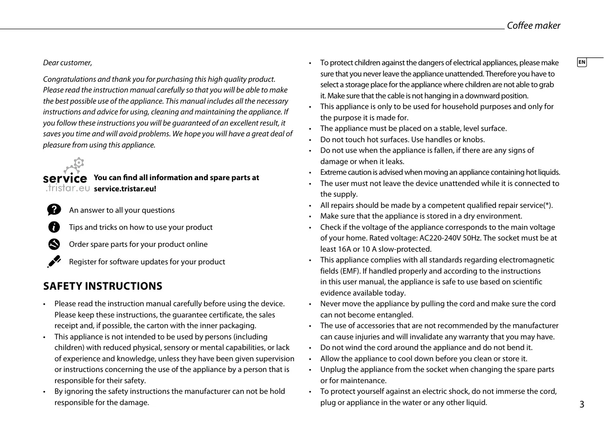 Service You can find all information and spare parts at .tristar.eu service.tristar.eu!