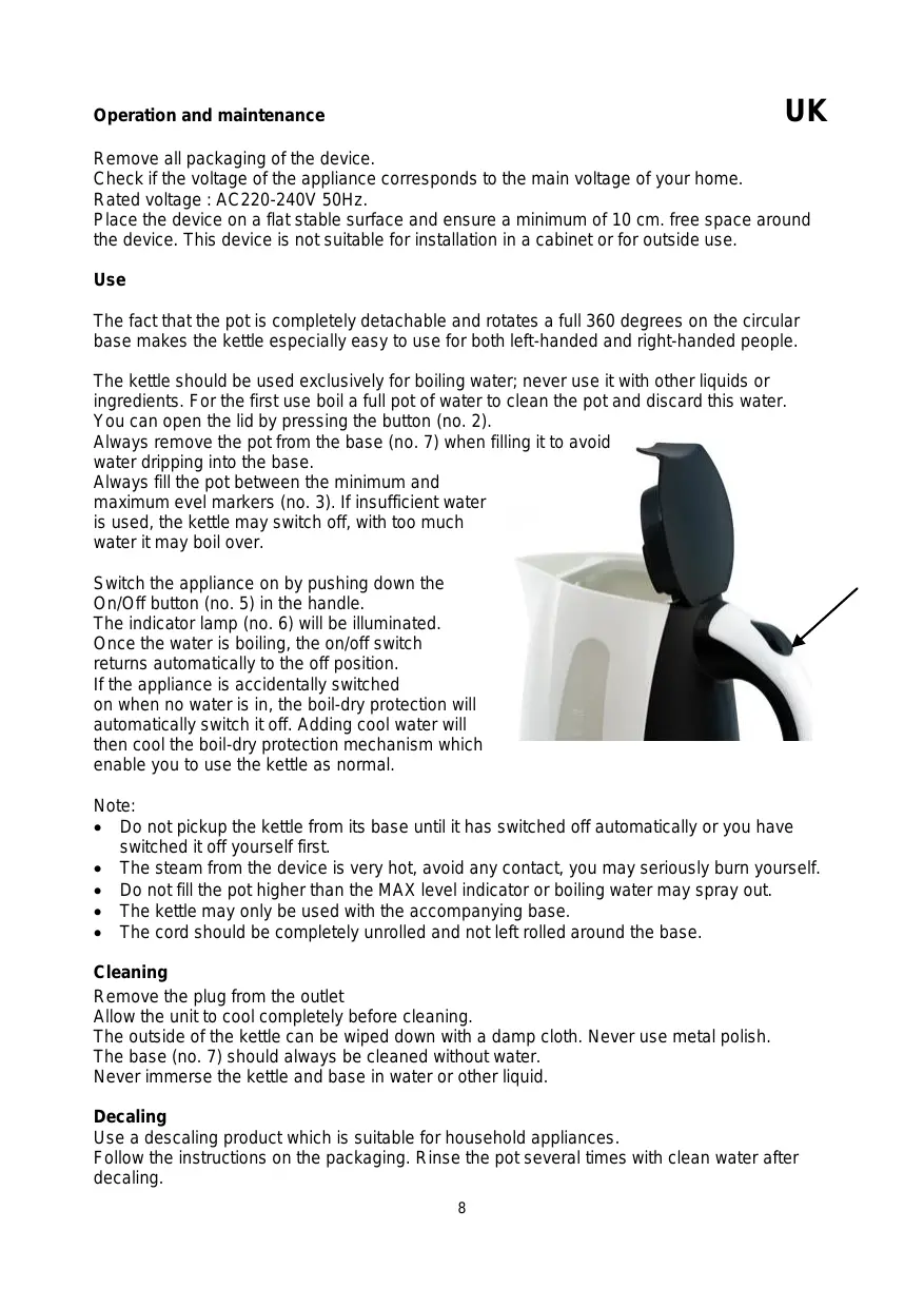 - Do not pickup the kettle from its base until it has switched off automatically or you have switched it off yourself first.