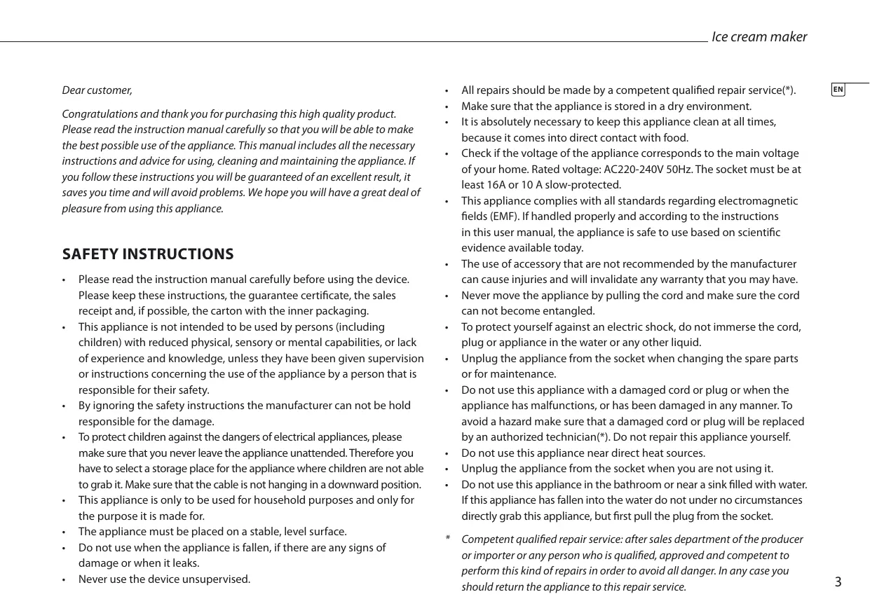 Ice cream maker Dear customer, Congratulations and thank you for purchasing this high quality product. Please read the instruction manual carefully so that you will be able to make the best possible use of the appliance. This manual includes all the necessary instructions and advice for using, cleaning and maintaining the appliance. If you follow these instructions you will be guaranteed of an excellent result, it saves you time and will avoid problems. We hope you will have a great deal of pleasure from using this appliance. Safety instructions