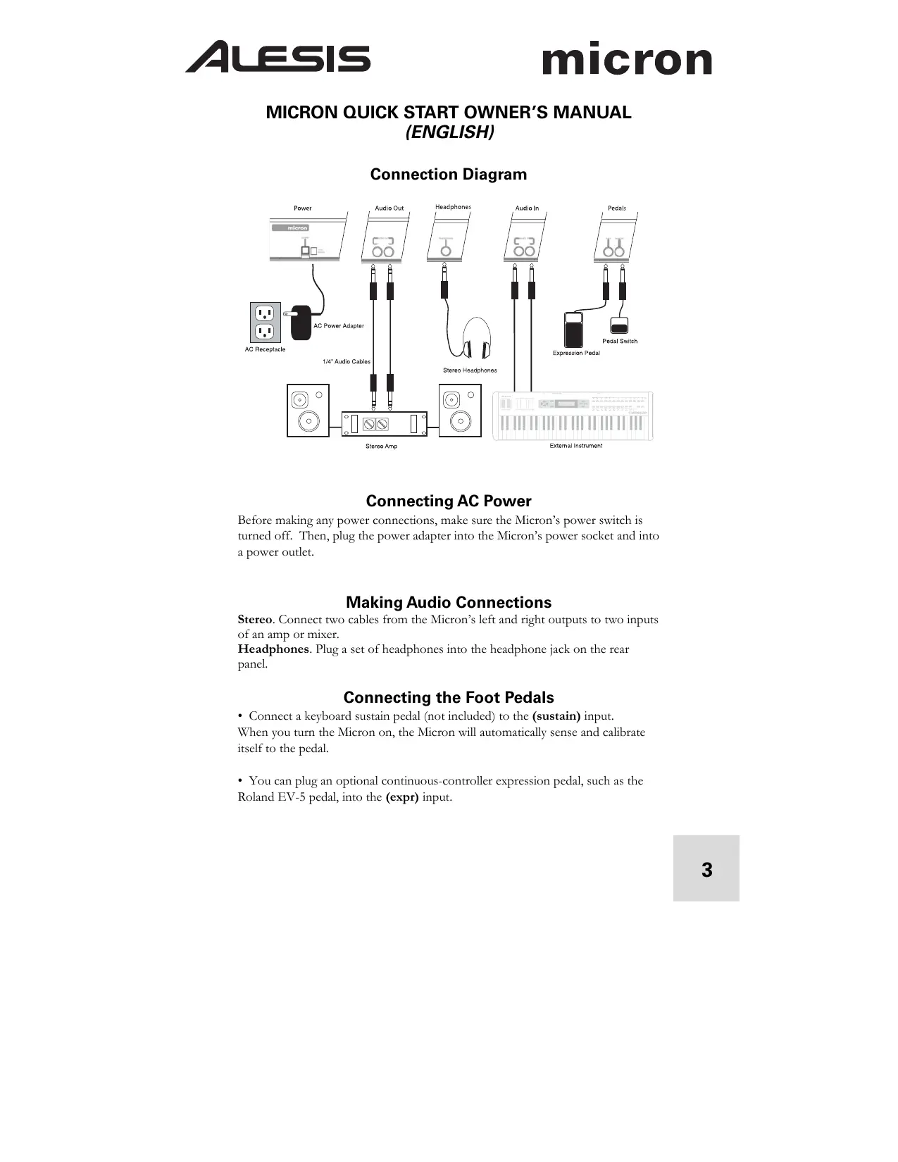 (ENGLISH) Connection Diagram Connecting AC Power Before making any power connections, make sure the Micron’s power switch is turned off. Then, plug the power adapter into the Micron’s power socket and into a power outlet. Making Audio Connections Stereo. Connect two cables from the Micron’s left and right outputs to two inputs of an amp or mixer. Headphones. Plug a set of headphones into the headphone jack on the rear panel. Connecting the Foot Pedals