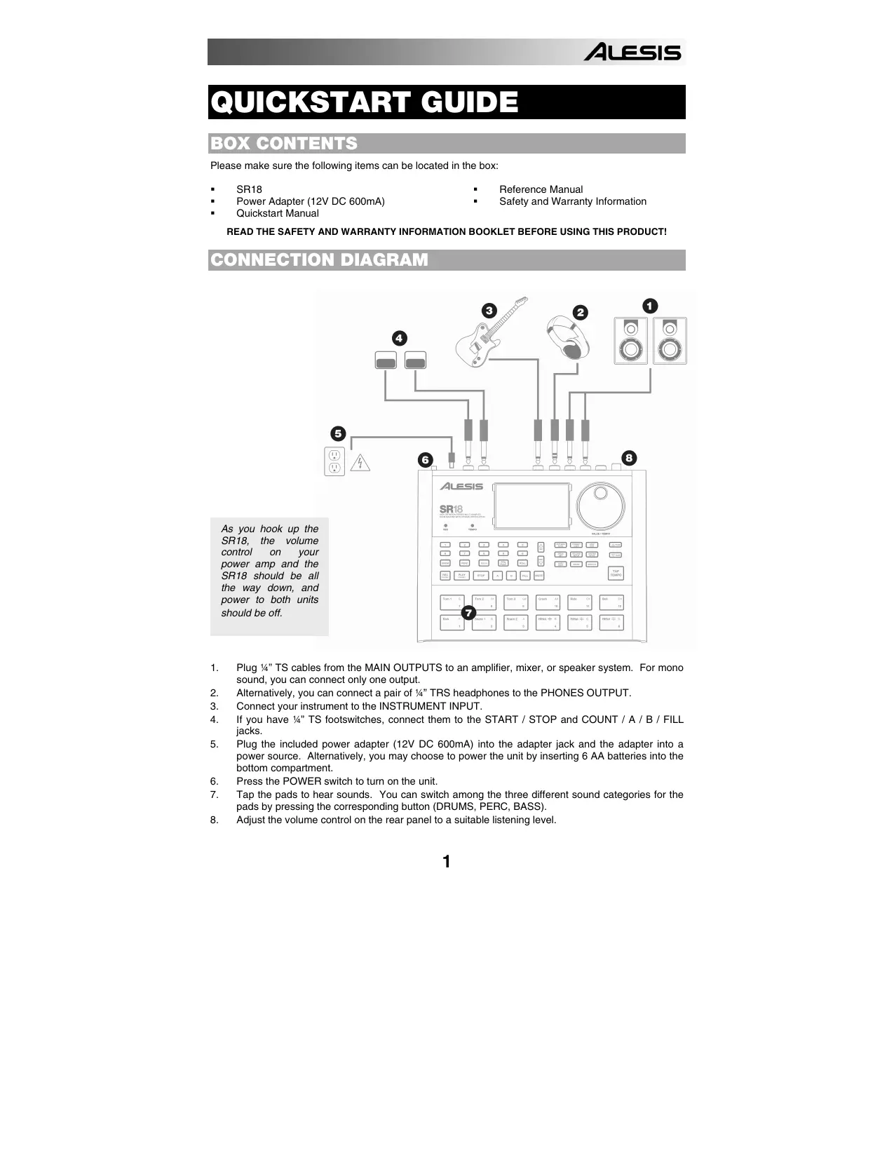 QUICKSTART MANUAL ENGLISH (1 – 14) QUICKSTART GUIDE BOX CONTENTS Please make sure the following items can be located in the box: SR18 Power Adapter (12V DC 600mA) Quickstart Manual Reference Manual Safety and Warranty Information READ THE SAFETY AND WARRANTY INFORMATION BOOKLET BEFORE USING THIS PRODUCT! CONNECTION DIAGRAM As you hook up the SR18, the volume control your power amp and the SR18 should be all the way down, and power to both units should be off.