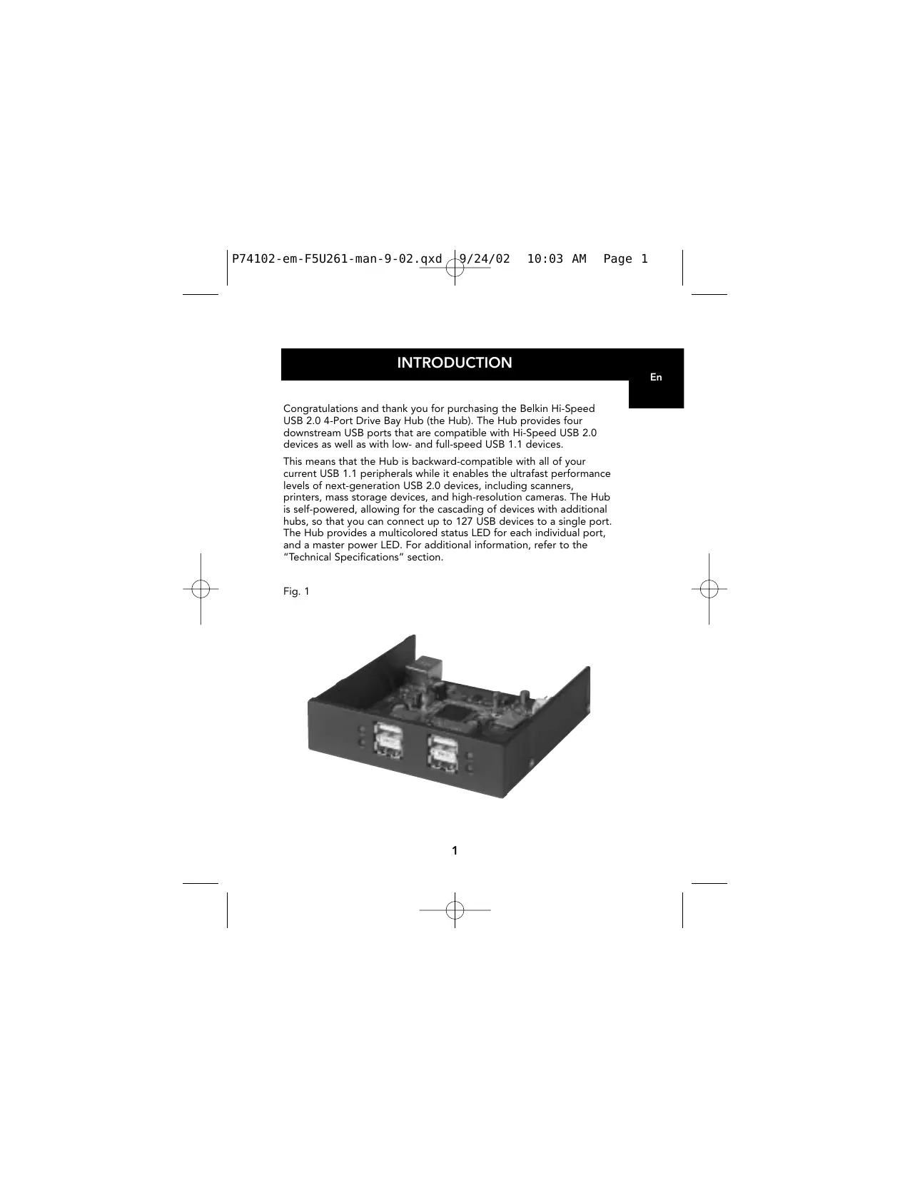 INTRODUCTION Congratulations and thank you for purchasing the Belkin Hi-Speed USB 2.0 4-Port Drive Bay Hub (the Hub). The Hub provides four downstream USB ports that are compatible with Hi-Speed USB 2.0 devices as well as with low- and full-speed USB 1.1 devices. This means that the Hub is backward-compatible with all of your current USB 1.1 peripherals while it enables the ultrafast performance levels of next-generation USB 2.0 devices, including scanners, printers, mass storage devices, and high-resolution cameras. The Hub is self-powered, allowing for the cascading of devices with additional hubs, so that you can connect up to 127 USB devices to a single port. The Hub provides a multicolored status LED for each individual port, and a master power LED. For additional information, refer to the “Technical Specifications” section. Fig. 1