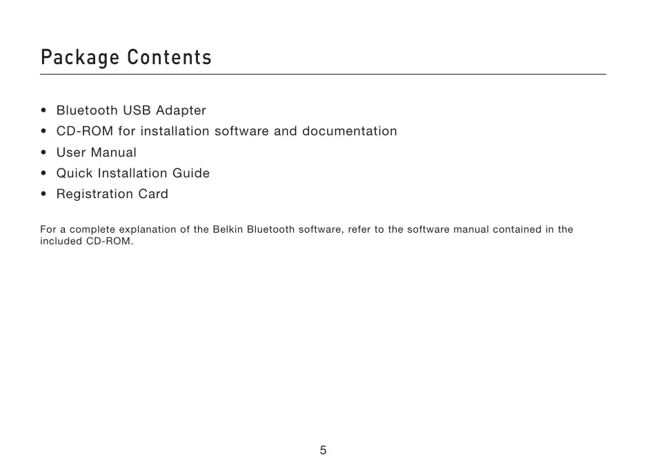 - Registration Card For a complete explanation of the Belkin Bluetooth software, refer to the software manual contained in the included CD-ROM.
