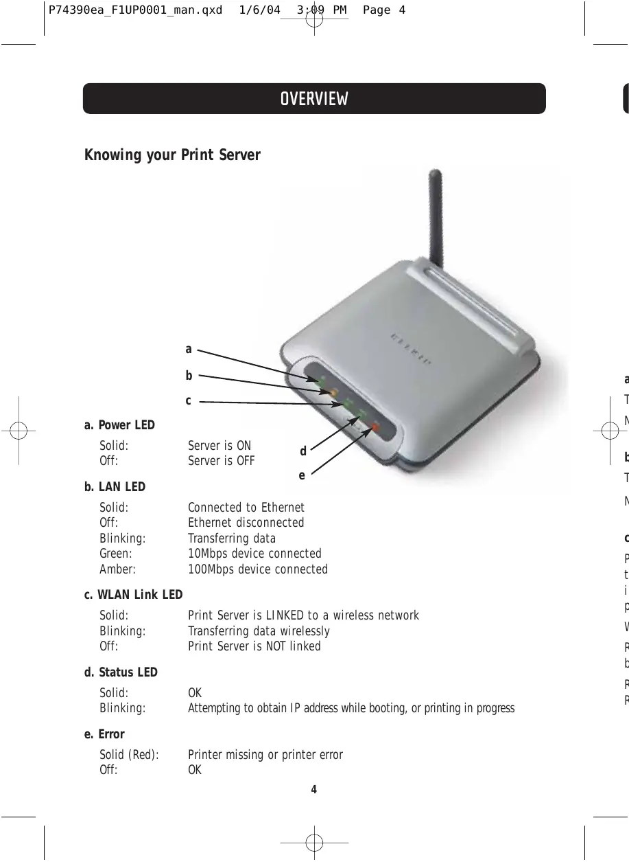 P74390ea_F1UP0001_man.qxd 1/6/04 3:09 PM Page 4 OVERVIEW Knowing your Print Server
