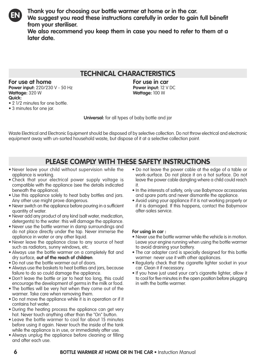 60 ml 90 ml 120 ml 150 ml 180 ml 210 ml 240 ml 270 ml 300 ml 330 ml Thank you for choosing our bottle warmer at home or in the car. We suggest you read these instructions carefully in order to gain full bénefit from your steriliser. We also recommend you keep them in case you need to refer to them at a later date. Power input: 220/230 V - 50 Hz Wattage: 320 W Quick:
