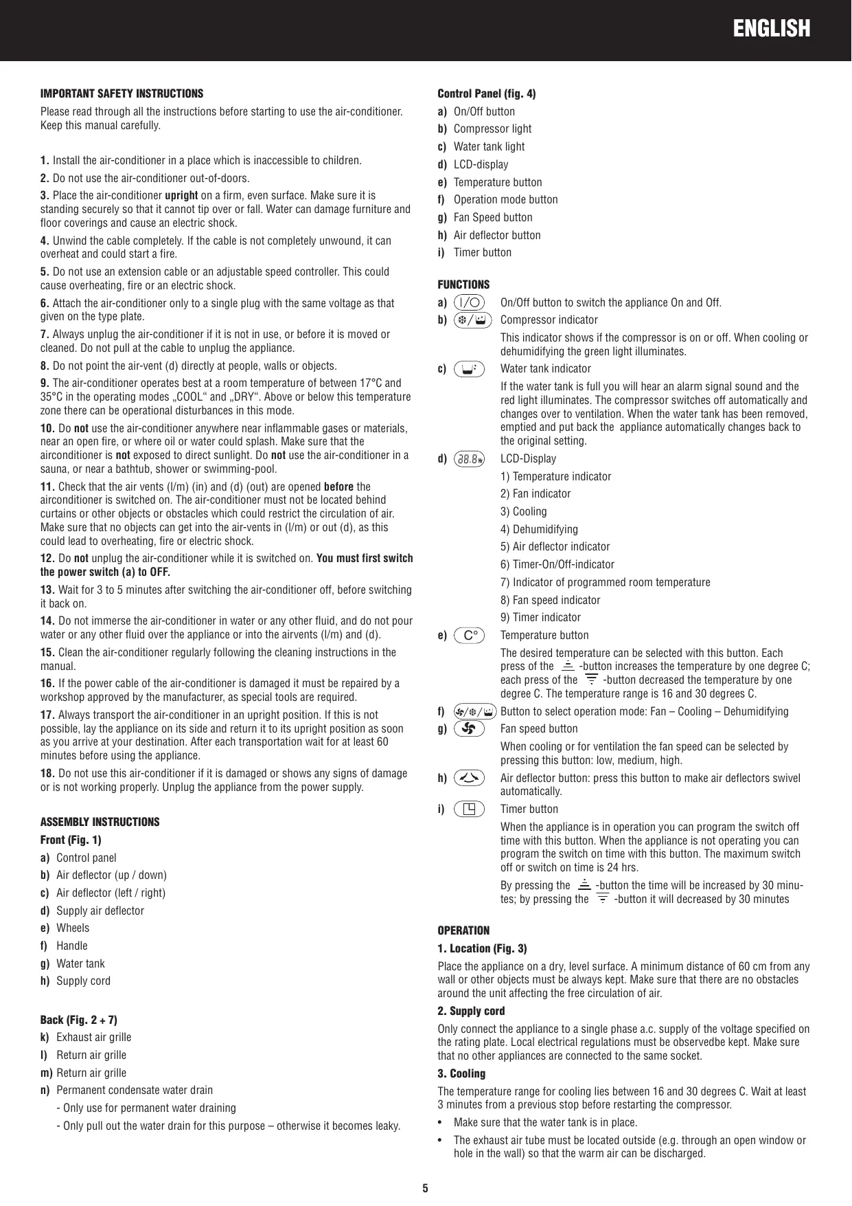 14. Do not immerse the air-conditioner in water or any other fluid, and do not pour water or any other fluid over the appliance or into the airvents (l/m) and (d).
