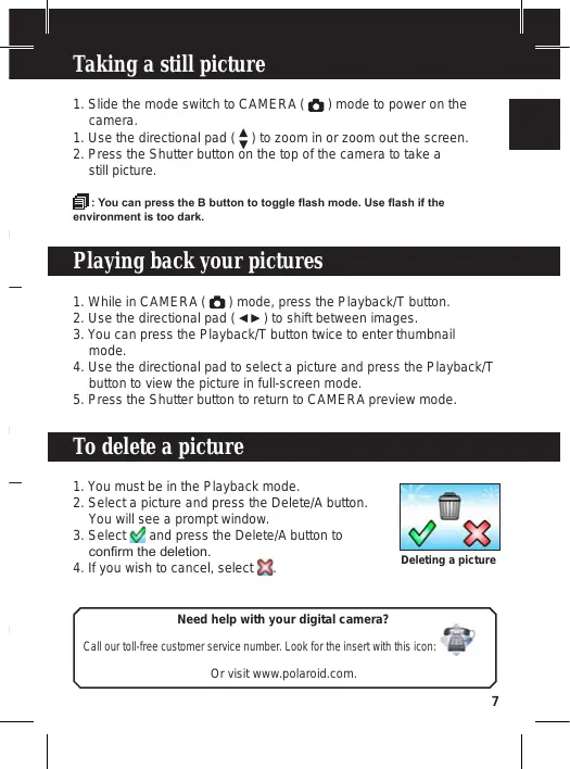 Deleting a picture Need help with your digital camera? Call our toll-free customer service number. Look for the insert with this icon: Or visit www.polaroid.com.