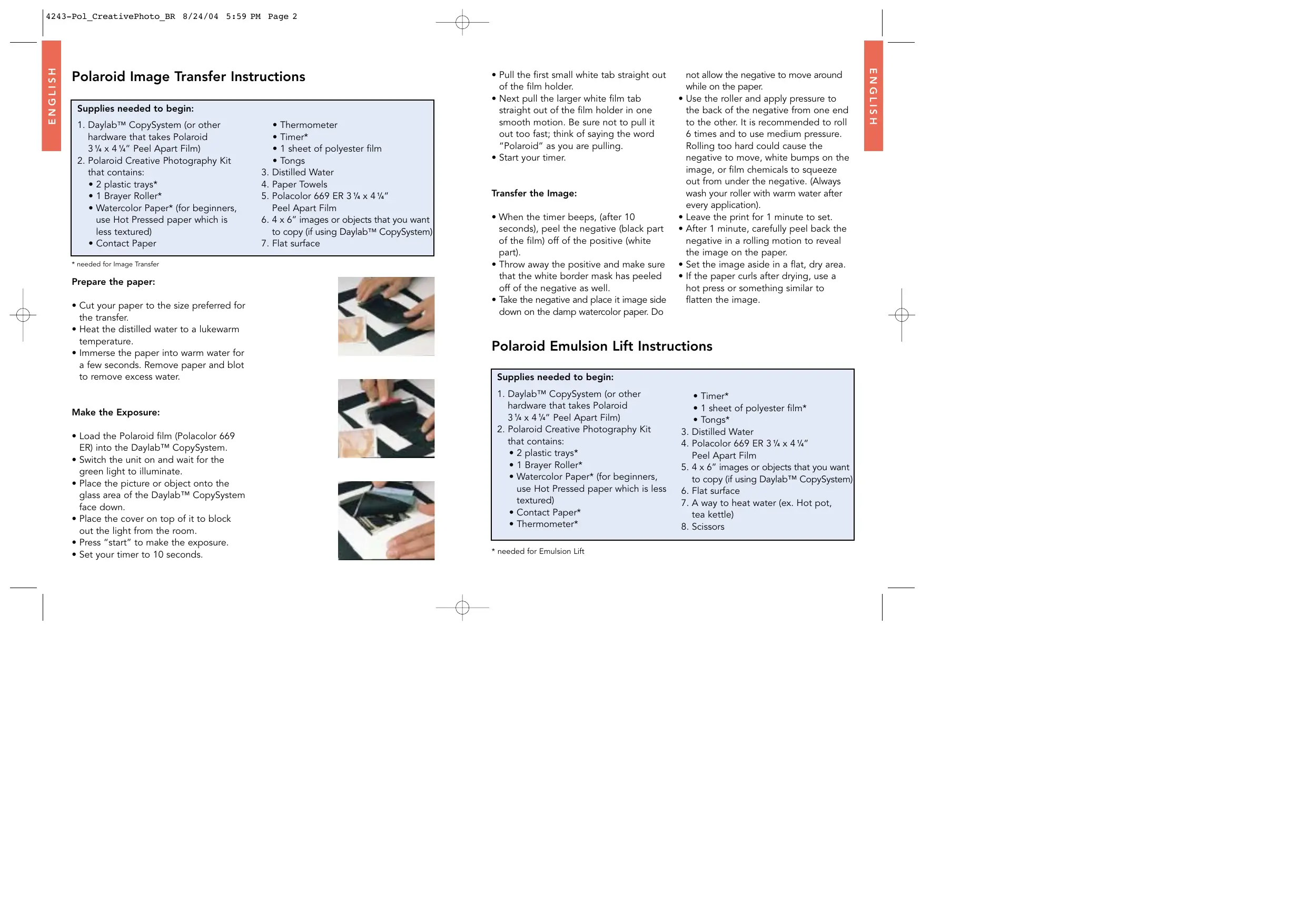 ventilated. Glossary Peel Apart Film: Most consumers think of Polaroid film as the square film with borders that develops itself inside a “sandwich” made up of several layers (Polaroid 600 film). Peel-apart films are the first generation of Polaroid films and are similar in that they develop themselves but need to be manually pulled out of the film holder, thus spreading the chemicals throughout the film plane, and developing the picture. Once that picture has fully developed, the negative must be peeled away from the positive, displaying the final image. Polaroid Negative: the long paper "negative" image that contains the green chemical pod and the white tab with black arrows. This piece is normally thrown away when making traditional Polaroid prints. The image is recorded onto the negative and once pulled out of the film holder and through the rollers, thus spreading the chemicals, the image begins to transfer from the negative to the positive. That is why with Image Transfer, you have to peel the two apart early, to stop the image from going onto the positive, and allowing it to go onto the watercolor paper instead. Polaroid Positive: the image, or "print." For Image Transfers, it is a faded image of the original scene. The positive has 4 even white borders around the edges and a manufacturing code (letters and numbers) on the back. This positive or print is much like a normal print that you would get from a 35mm camera. While processing, the image is transferred from the negative to the positive. After the full development time, the entire image is transferred and one is able to peel the positive away from the negative revealing the final image. The Polaroid positive contains the emulsion layer on the top that is then able to be "lifted" off during the Emulsion Lift process. Daylab™ CopySystem: A product produced by Daylab™ Corporation that is much like a traditional photocopier, but copies a photo or object onto Polaroid peel-apart film. The Daylab™ CopySystem can be found in some photo stores and online. www.daylab.com. Polacolor 669 ER: This is the name of the film that should be used when doing Image Transfer and Emulsion Lift. Polaroid makes several kinds of film in several different sizes. Polacolor 669 ER is a color peel apart film that measures 3 1/4 x 4 1/4". Polacolor 669 ER can be purchased at most photography stores and found online. Hot pressed paper: Watercolor paper comes in several different styles and sizes. When starting out, Polaroid recommends using Hot pressed paper because it is smoother than other kinds and is therefore easier to use. As you improve at Image Transfer, you can move onto more textured papers and surfaces. Polaroid Emulsion: The plastic layers of Polaroid film containing imaging dyes that make up the photograph. RESOURCES: