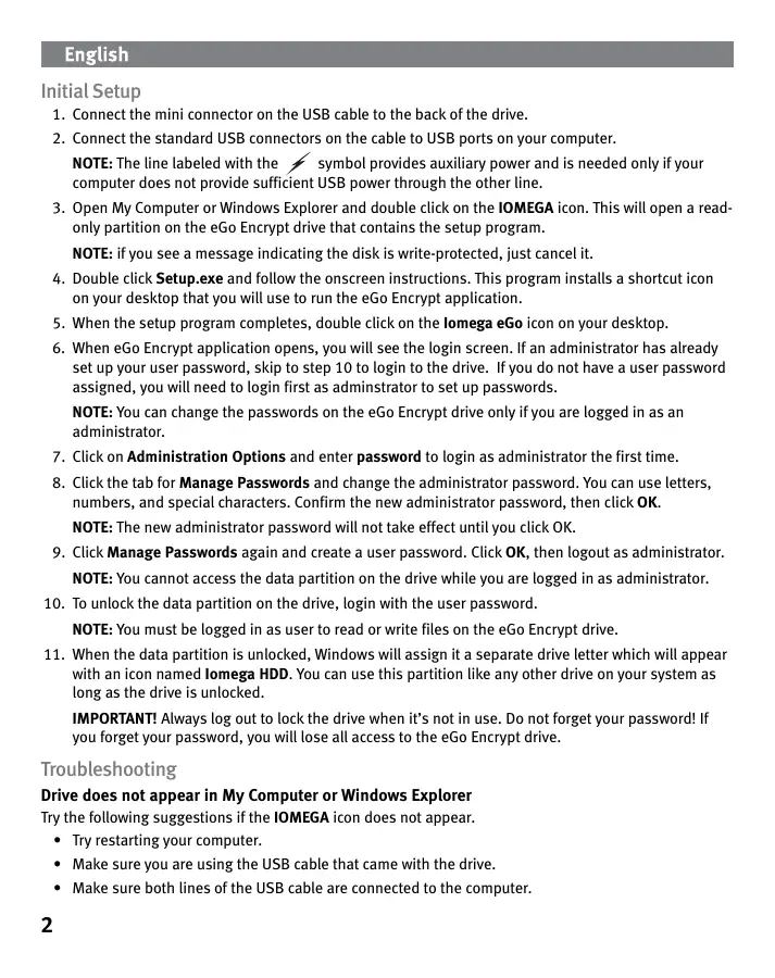 symbol provides auxiliary power and is needed only if your NOTE: The line labeled with the computer does not provide sufficient USB power through the other line. 3. Open My Computer or Windows Explorer and double click on the IOMEGA icon. This will open a readonly partition on the eGo Encrypt drive that contains the setup program. NOTE: if you see a message indicating the disk is write-protected, just cancel it.
