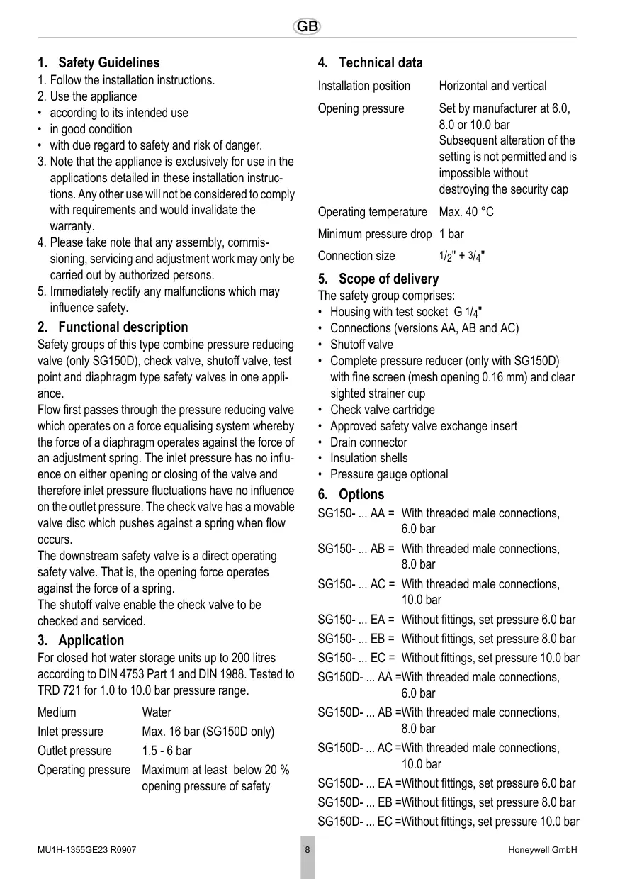 6. Options SG150- ... AA = With threaded male connections, 6.0 bar SG150- ... AB = With threaded male connections, 8.0 bar SG150- ... AC = With threaded male connections, 10.0 bar SG150- ... EA = Without fittings, set pressure 6.0 bar SG150- ... EB = Without fittings, set pressure 8.0 bar SG150- ... EC = Without fittings, set pressure 10.0 bar SG150D- ... AA =With threaded male connections, 6.0 bar SG150D- ... AB =With threaded male connections, 8.0 bar SG150D- ... AC =With threaded male connections, 10.0 bar SG150D- ... EA =Without fittings, set pressure 6.0 bar SG150D- ... EB =Without fittings, set pressure 8.0 bar SG150D- ... EC =Without fittings, set pressure 10.0 bar