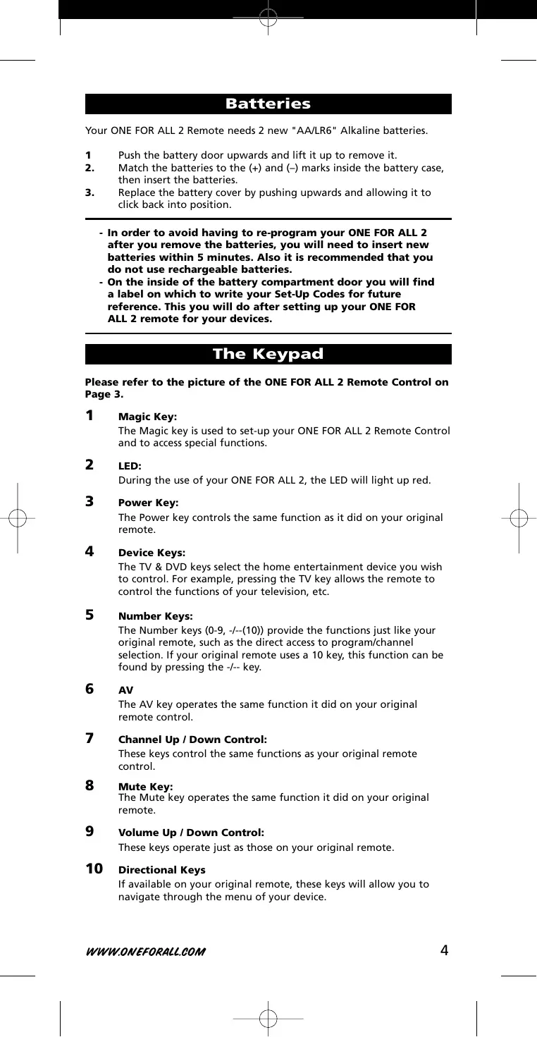 - In order to avoid having to re-program your ONE FOR ALL 2 after you remove the batteries, you will need to insert new batteries within 5 minutes. Also it is recommended that you do not use rechargeable batteries.