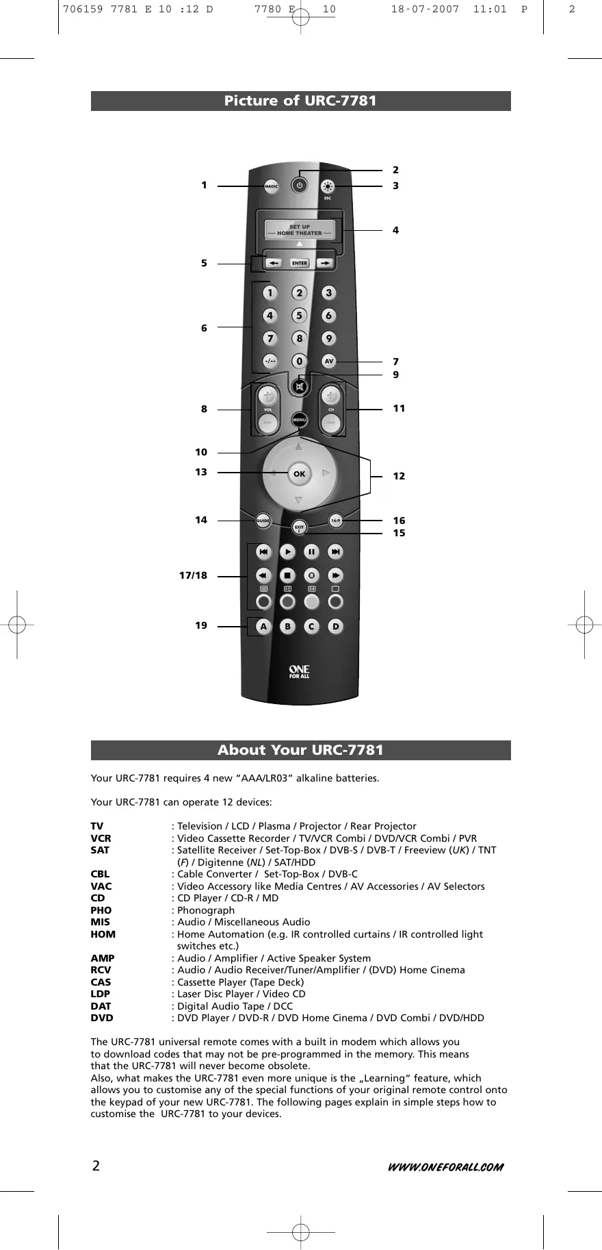 Find the device manual for free URC 7781 ONEFORALL in PDF.