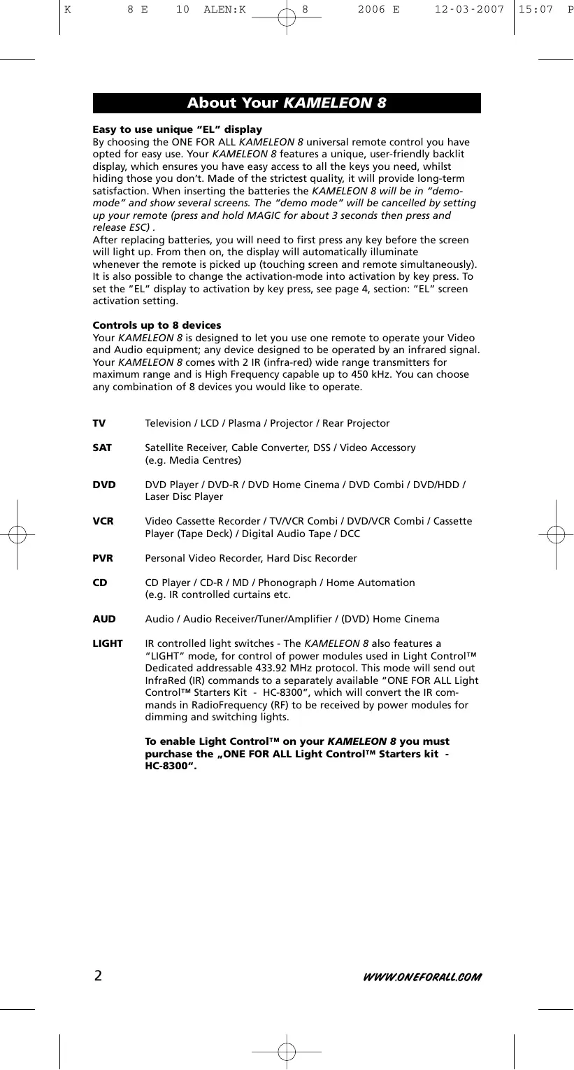 The TV, SAT, DVD, VCR, PVR, CD, AUD and LIGHT keys select the device to be controlled. For example pressing the TV key allows the remote to control the functions of your Television, after pressing VCR you can operate your Video Recorder, after pressing the SAT key you can operate your Satellite Receiver or Cable Converter etc. (see page 2 for more details). After pressing a device (mode) key on your KAMELEON 8 the applicable device icon will animate, to show the currently activated mode. Pressing the device key will allow you to return to the main screen (TV, SAT and AUD modes). The KAMELEON 8 also features a “LIGHT” mode. Together with a separately available “ONE FOR ALL Light Control™ Starters Kit - HC-8300”, this allows you to dim and switch ON/OFF lights through-out your whole house.