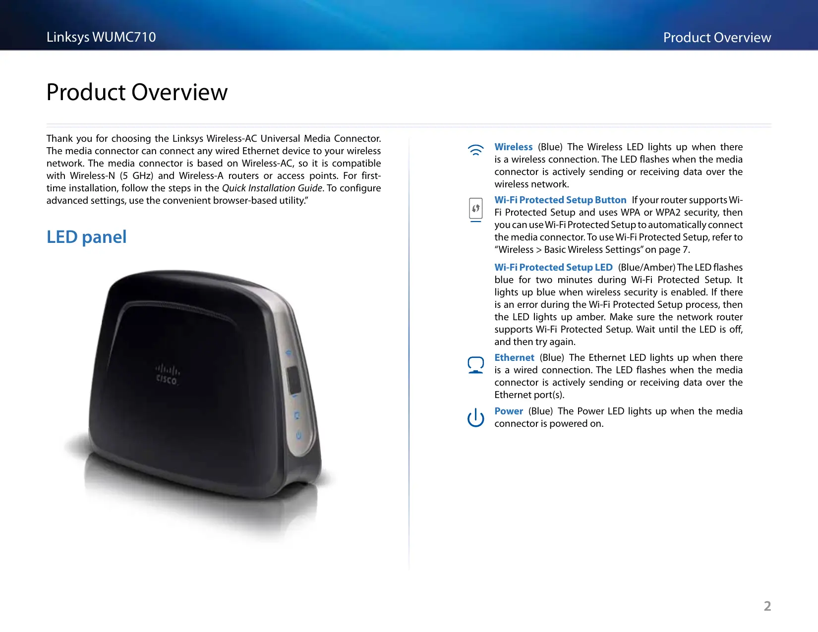 Wi-Fi Protected Setup Button If your router supports WiFi Protected Setup and uses WPA or WPA2 security, then you can use Wi-Fi Protected Setup to automatically connect the media connector. To use Wi-Fi Protected Setup, refer to “Wireless > Basic Wireless Settings” on page 7. Wi-Fi Protected Setup LED (Blue/Amber) The LED flashes blue for two minutes during Wi-Fi Protected Setup. It lights up blue when wireless security is enabled. If there is an error during the Wi‑Fi Protected Setup process, then the LED lights up amber. Make sure the network router supports Wi‑Fi Protected Setup. Wait until the LED is off, and then try again. Ethernet (Blue) The Ethernet LED lights up when there is a wired connection. The LED flashes when the media connector is actively sending or receiving data over the Ethernet port(s). Power (Blue) The Power LED lights up when the media connector is powered on.