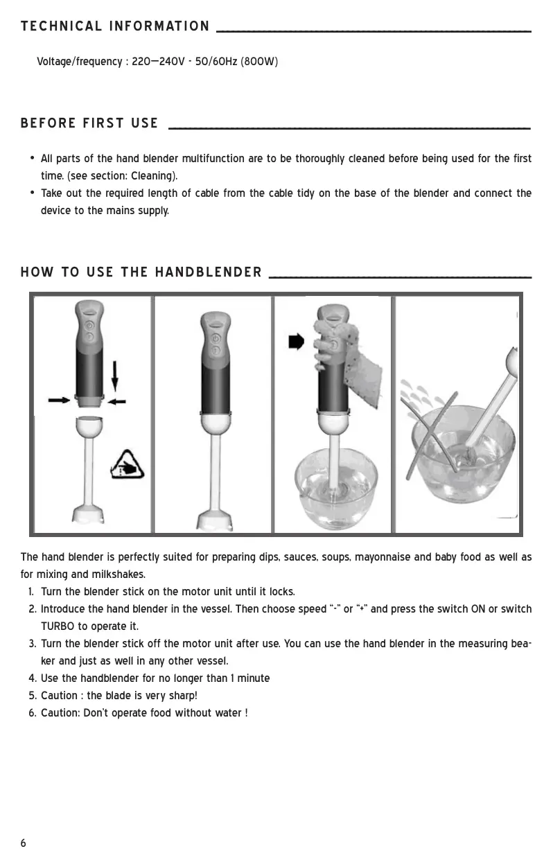 2. Placez le mixeur dans le bol. Choisissez ensuite une vitesse “-” ou “+” et appuyez sur le bouton ON ou TURBO pour l’appliquer. 3. Après utilisation, détachez le mixeur du bloc moteur. Vous pouvez utiliser le mixeur dans le verre mesureur mais dans tout autre bol également. 4. N’utilisez pas le mixeur pendant plus d’une minute 5. Attention : la lame est très tranchante ! 6. Attention : ne pas mixer d’aliments sans avoir ajouter de l’eau !