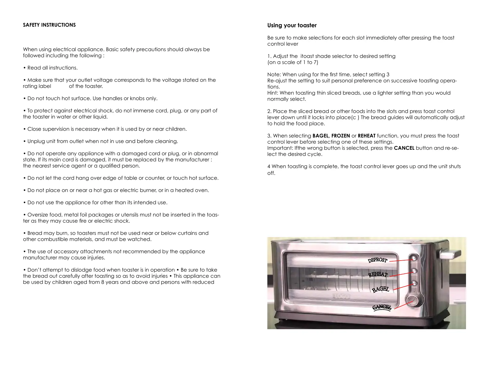 • Lire l’intégralité des consignes avant d’utiliser l’appareil. • vérifier que le voltage indiqué sur l’appareil correspond à celui de votre installation domestique. • Ne pas toucher les surfaces chaudes. N’utiliser que les poignées et boutons prévus. • Afin d’éviter tout risque d’incendie, de décharge électrique ou de blessures, ne pas immerger le cordon, les prises électrique ou le grillepain dans l’eau ou tout autre liquide. • Une surveillance rapprochée est nécessaire lorsque l’appareil est utilisé par des enfants ou à proximité d’eux. • Débrancher de la prise d’alimentation lorsque l’appareil n’est pas utilisé ou avant de le nettoyer. • Ne jamais utiliser un appareil dont le cordon ou la prise serait endommagé, ou si l’appareil fonctionne mal ou est abimé. Ramener l’appareil auprès d’un SAv agréé pour examen, réparation ou réglage. • Ne pas laisser le cordon pendre du plan de travail ou entrer en contact avec une surface chaude. • Ne pas placer sur une plaque chauffante ou près d’elle, ni sur un brûleur électrique ou un four chaud. • Ne pas utiliser l’appareil pour un autre usage que celui pour lequel il a été conçu. • Ne pas insérer des aliments trop épais, des emballages en aluminium ou des ustensiles au risque de provoquer un incendie ou une décharge électrique. • Le pain pouvant brûler, le grille-pain ne doit pas être placé à proximité de rideaux ou de tout autre tissu inflammables et toujours sous surveillance. • L’utilisation d’accessoires qui ne sont pas recommandés par le fabricant peut être source d’in- cendie, de décharge électrique ou de blessure. • Ne pas essayer de retirer la nourriture lorsque le grille-pain est en marche. • veiller à retirer le pain avec précaution lorsqu’il est grillé pour éviter le risque de blessure.