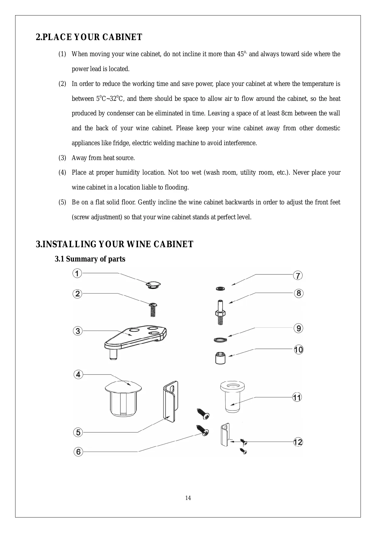 2.PLACE YOUR CABINET (1) When moving your wine cabinet, do not incline it more than 45o, and always toward side where the power lead is located. (2) In order to reduce the working time and save power, place your cabinet at where the temperature is between 5oC~32oC, and there should be space to allow air to flow around the cabinet, so the heat produced by condenser can be eliminated in time. Leaving a space of at least 8cm between the wall and the back of your wine cabinet. Please keep your wine cabinet away from other domestic appliances like fridge, electric welding machine to avoid interference. (3) Away from heat source. (4) Place at proper humidity location. Not too wet (wash room, utility room, etc.). Never place your wine cabinet in a location liable to flooding. (5) Be on a flat solid floor. Gently incline the wine cabinet backwards in order to adjust the front feet (screw adjustment) so that your wine cabinet stands at perfect level.