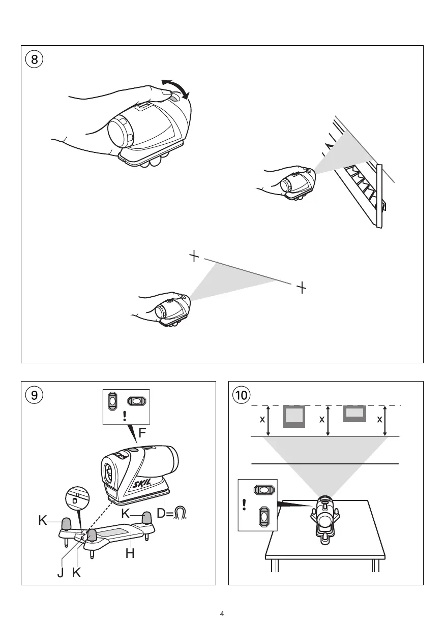 MAINTENANCE / SERVICE • Do not expose the tool to continuous vibration or extremely hot or cold temperatures • Always store the tool indoors in its protective carton/ case • Always keep the tool free of dust, moisture and direct sunlight • Clean the tool with a damp cloth ! always remove the batteries before cleaning the lens • Do not disassemble or modify the tool in any way • Do not attempt to change any part of the laser lens • If the tool should fail despite the care taken in manufacturing and testing procedures, repair should be carried out by an after-sales service centre for SKIL power tools - send the tool undismantled together with proof of purchase to your dealer or the nearest SKIL servicestation (addresses are listed on www.skileurope.com)