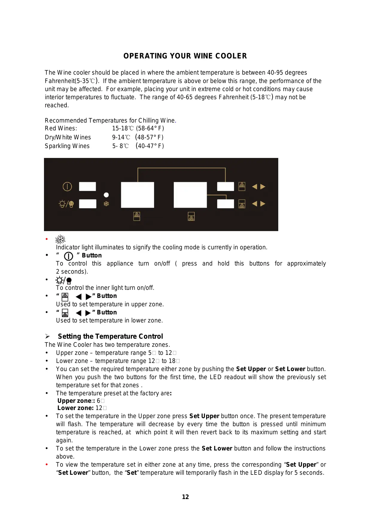 The Wine Cooler has two temperature zones. • Upper zone – temperature range 5 to 12 • Lower zone – temperature range 12 to 18 • You can set the required temperature either zone by pushing the Set Upper or Set Lower button. When you push the two buttons for the first time, the LED readout will show the previously set temperature set for that zones . • The temperature preset at the factory are: Upper zone:: 6 Lower zone: 12 • To set the temperature in the Upper zone press Set Upper button once. The present temperature will flash. The temperature will decrease by every time the button is pressed until minimum temperature is reached, at which point it will then revert back to its maximum setting and start again. • To set the temperature in the Lower zone press the Set Lower button and follow the instructions above. • To view the temperature set in either zone at any time, press the corresponding “Set Upper” or “Set Lower” button, the “Set” temperature will temporarily flash in the LED display for 5 seconds.