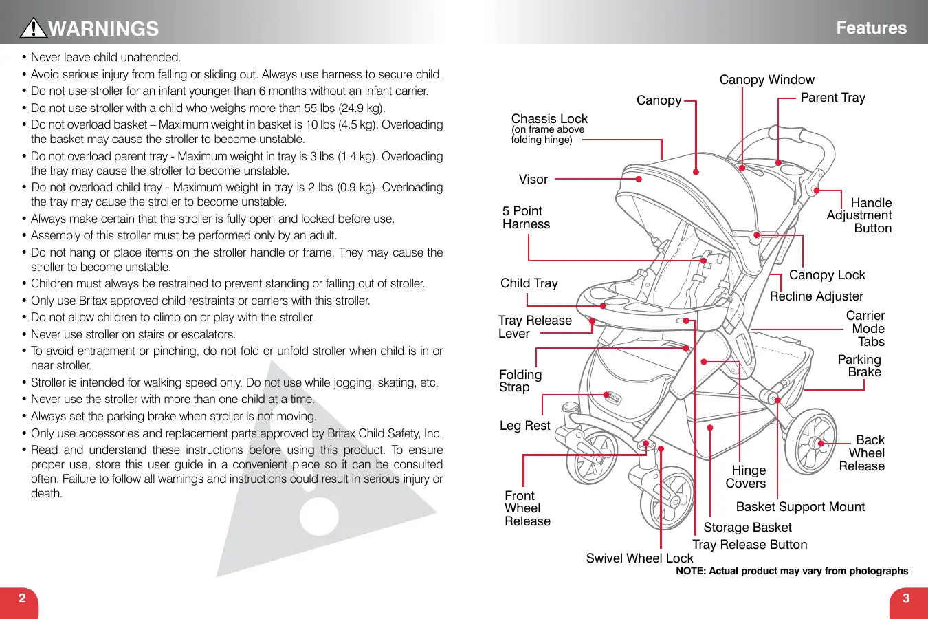 WARNINGS • Never leave child unattended. • Avoid serious injury from falling or sliding out. Always use harness to secure child. • Do not use stroller for an infant younger than 6 months without an infant carrier. • Do not use stroller with a child who weighs more than 55 lbs (24.9 kg). • Do not overload basket – Maximum weight in basket is 10 lbs (4.5 kg). Overloading the basket may cause the stroller to become unstable. • Do not overload parent tray - Maximum weight in tray is 3 lbs (1.4 kg). Overloading the tray may cause the stroller to become unstable. • Do not overload child tray - Maximum weight in tray is 2 lbs (0.9 kg). Overloading the tray may cause the stroller to become unstable. • Always make certain that the stroller is fully open and locked before use. • Assembly of this stroller must be performed only by an adult. • Do not hang or place items on the stroller handle or frame. They may cause the stroller to become unstable. • Children must always be restrained to prevent standing or falling out of stroller. • Only use Britax approved child restraints or carriers with this stroller. • Do not allow children to climb on or play with the stroller. • Never use stroller on stairs or escalators. • To avoid entrapment or pinching, do not fold or unfold stroller when child is in or near stroller. • Stroller is intended for walking speed only. Do not use while jogging, skating, etc. • Never use the stroller with more than one child at a time. • Always set the parking brake when stroller is not moving. • Only use accessories and replacement parts approved by Britax Child Safety, Inc. • Read and understand these instructions before using this product. To ensure proper use, store this user guide in a convenient place so it can be consulted often. Failure to follow all warnings and instructions could result in serious injury or death.