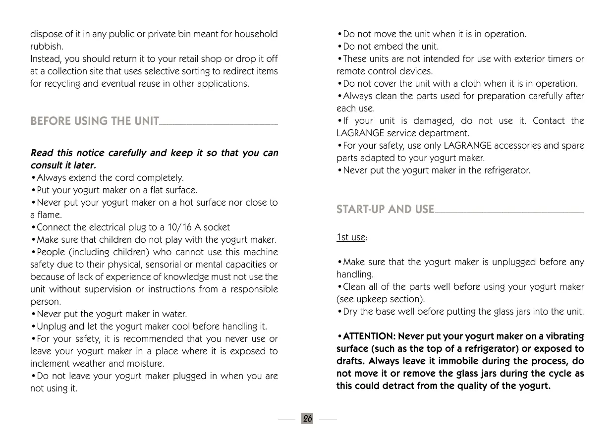 - For your safety, use only LAGRANGE accessories and spare parts adapted to your yogurt maker.